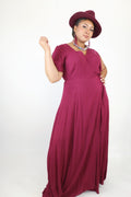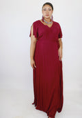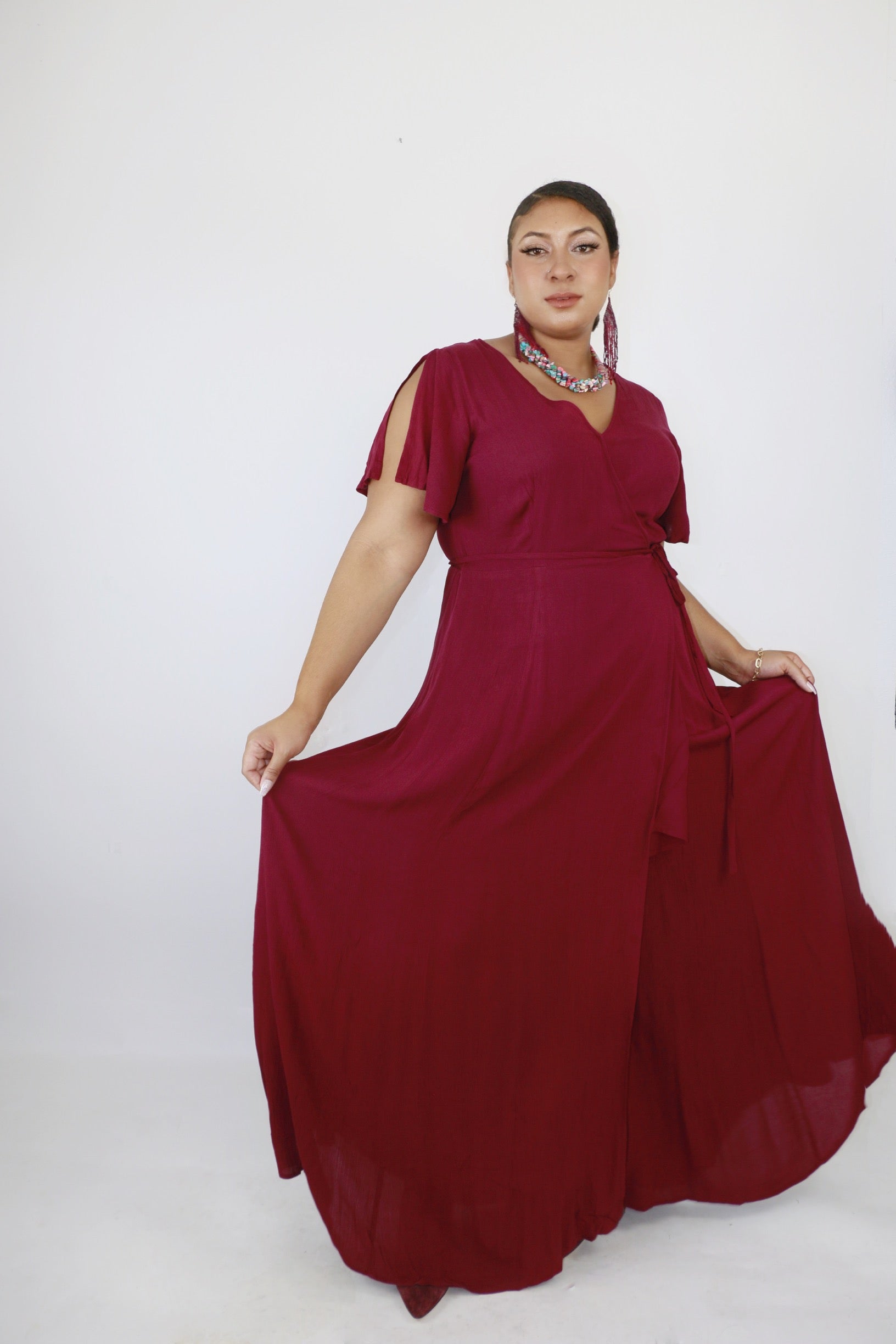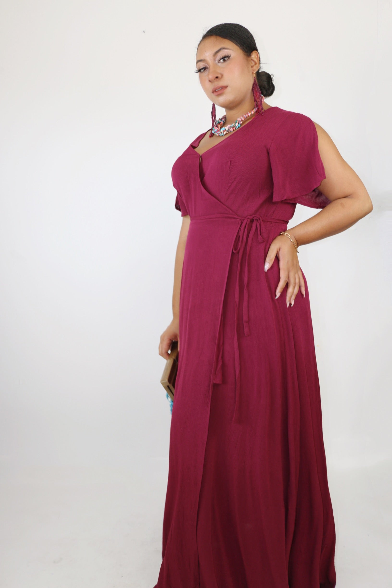 This elegant dress is a classic wrap dress in a rich burgundy color. The wrap maxi dress features a flattering fit and an elegant, airy design. It's a great way to add a touch of sophistication to your event without too much over thinking. The flowing style of this dress is perfect when attending a wedding or a Sunday brunch. This dress is designed to flatter your figure.