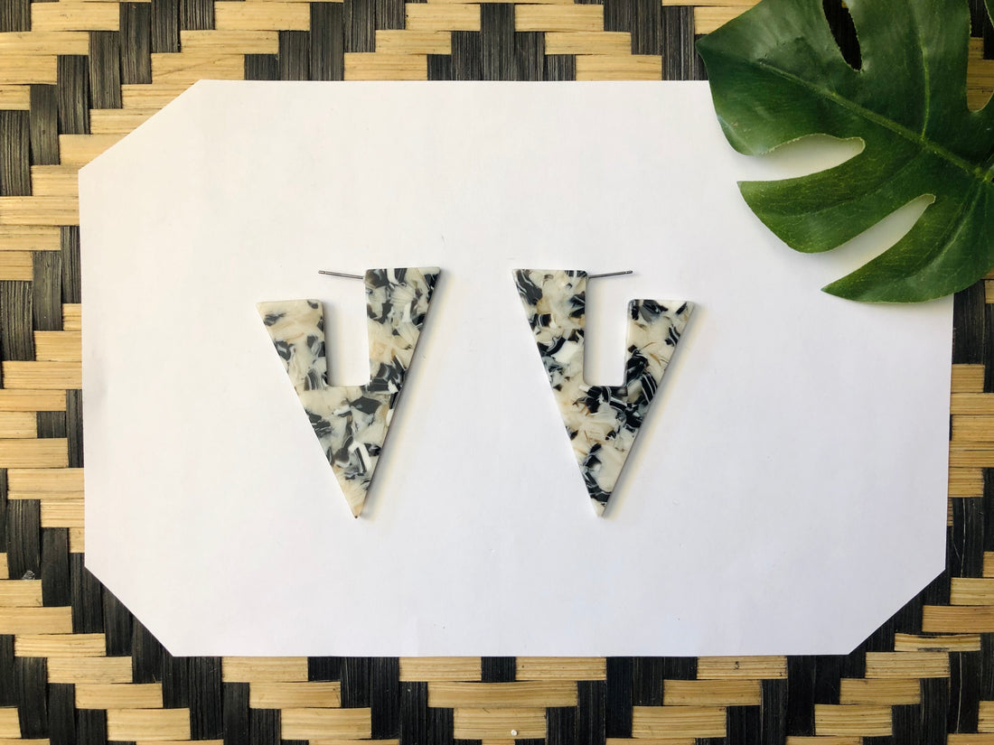 Deep cut V-shaped acrylic earrings. Touches of ivory, black, and gray.
