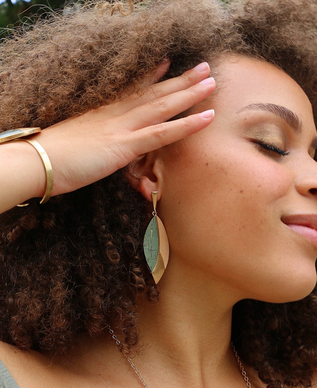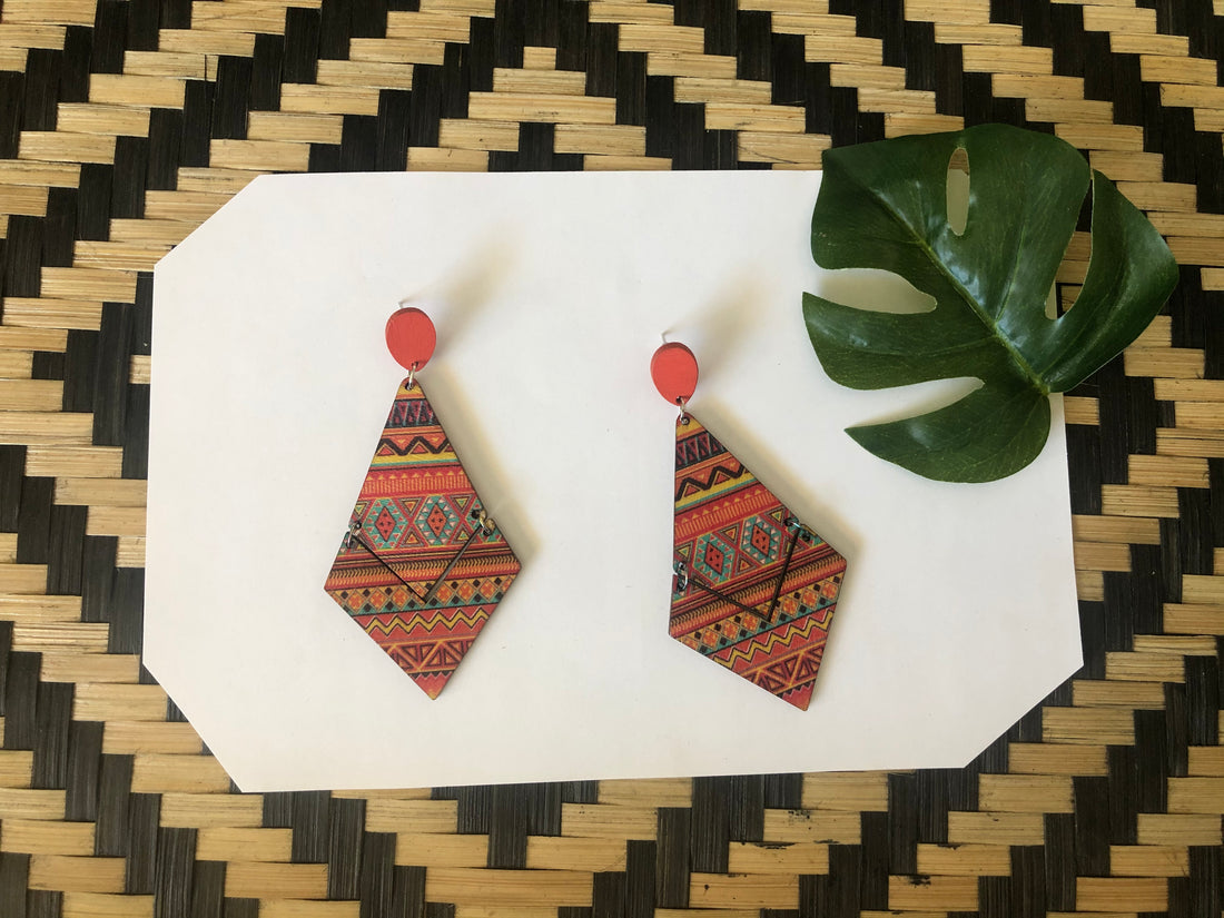 Mosaic style earrings made of wood variations and brushed fold.Β Approximately 2 inches in length and...