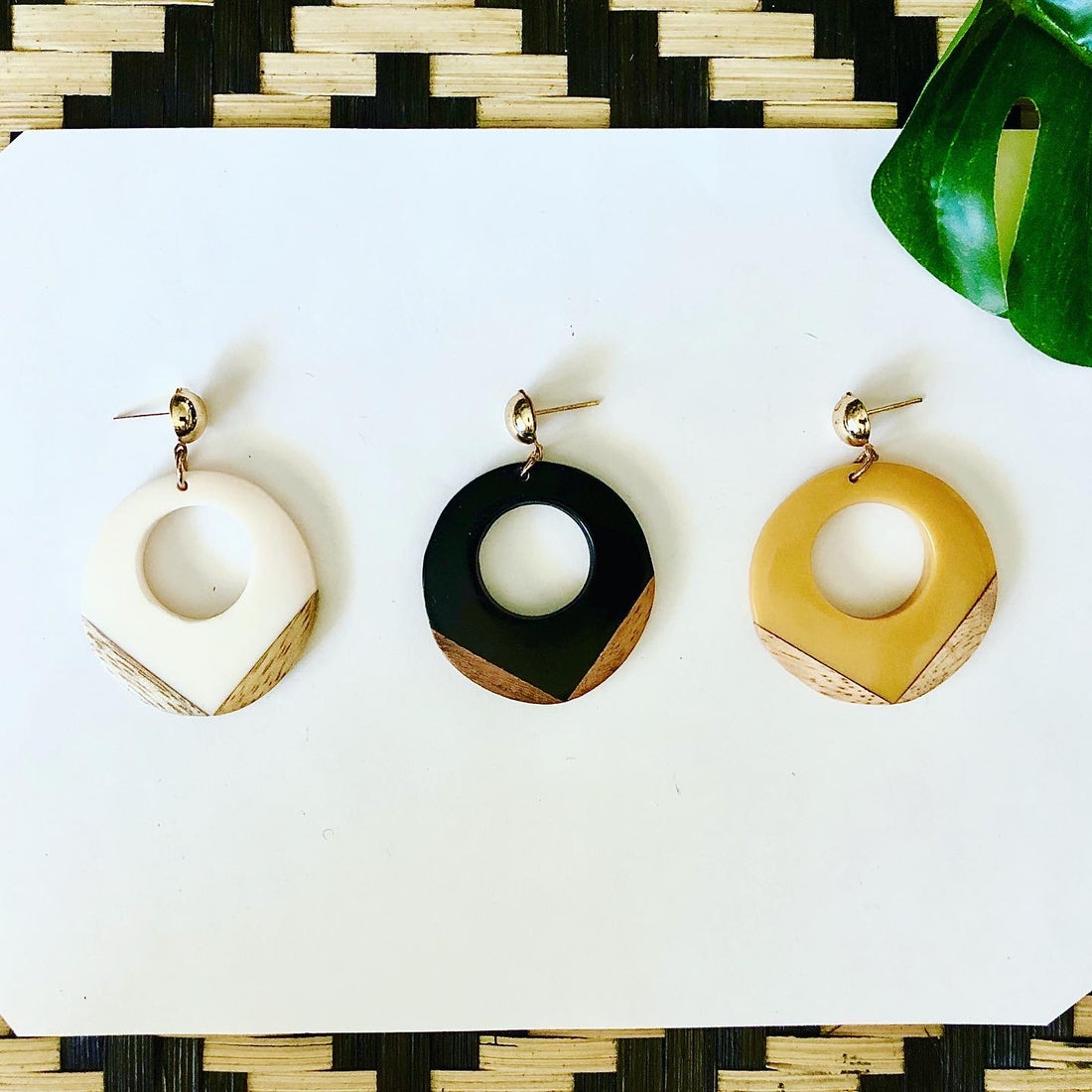 Simple, yet lovely wood and acrylic combination earrings. Fairly light in weight.Β
