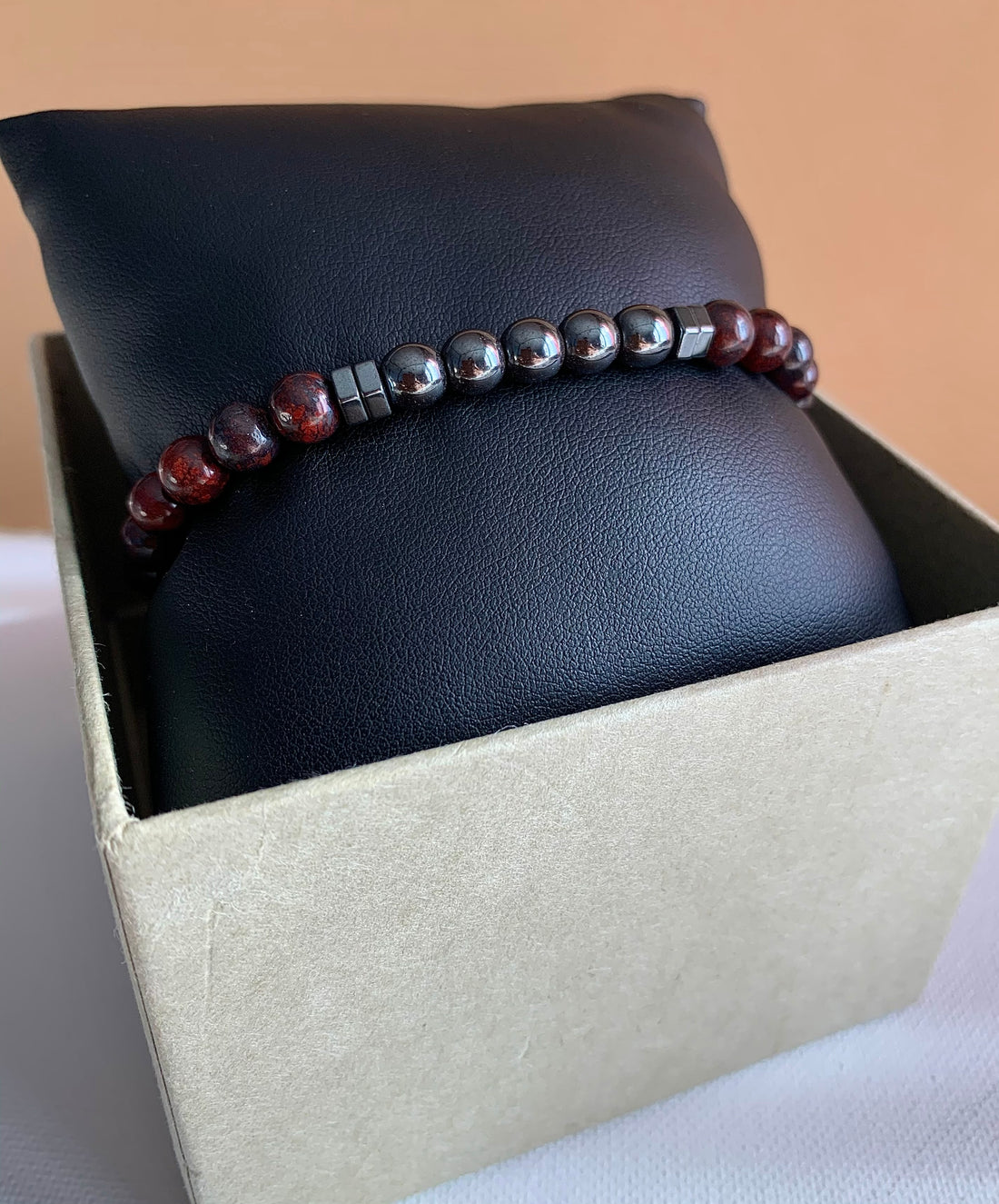 Endurance. Stamina. Transformation. This bracelet is madeΒ of red Jasper stones and hematite stone bead accents....