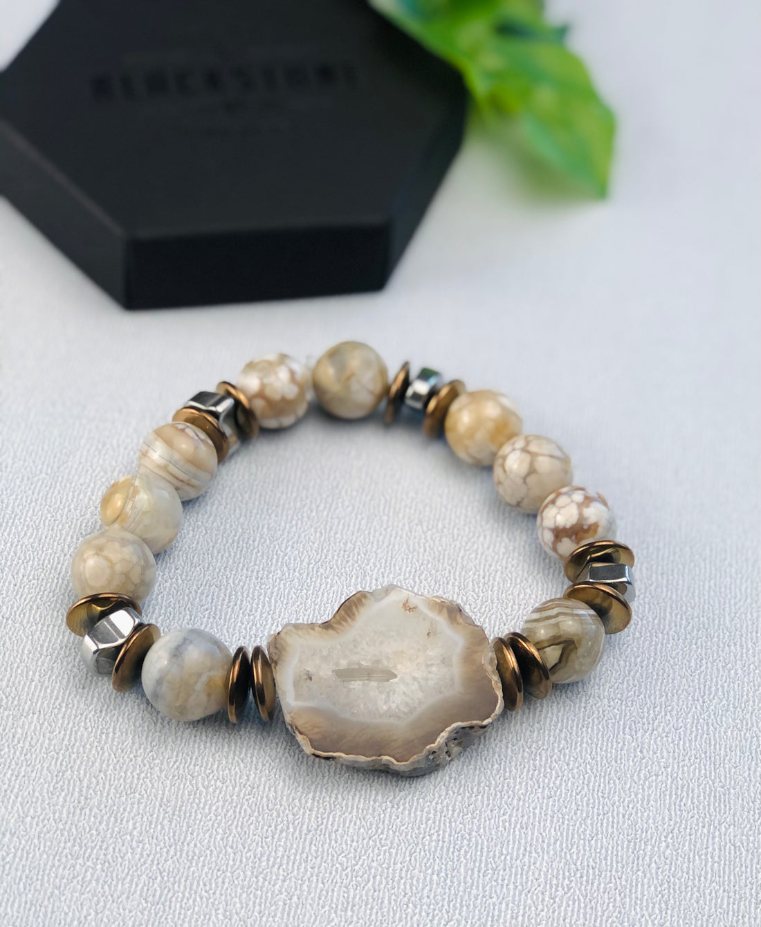 uniquely cut white/tan mixed agate stone flanked with silver and gold hematite stone disks. Features...