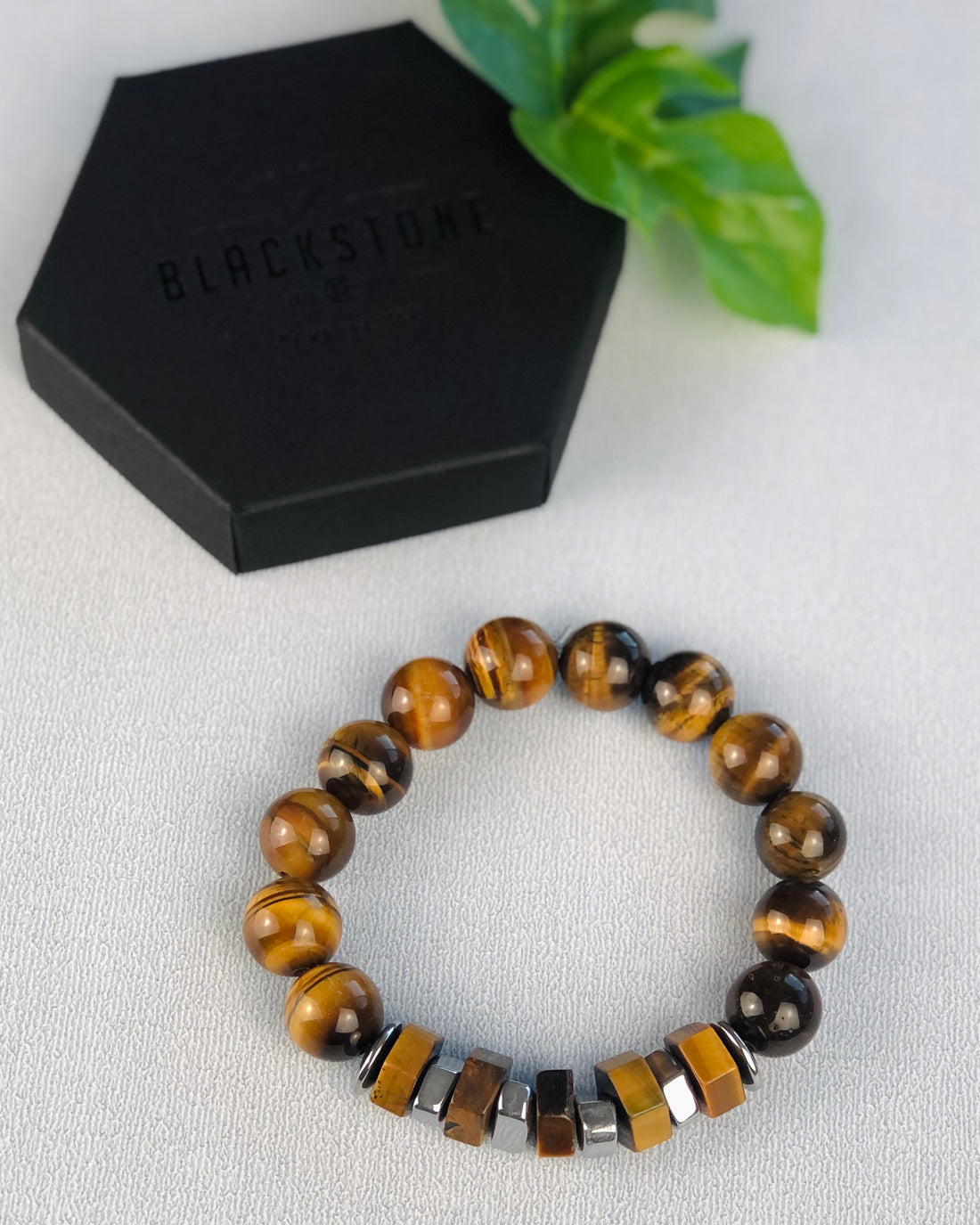 Bold, brown tigerβs eye stone polished bracelet. Unique hexagon cuts flanked with silver hematite stone.Β ...