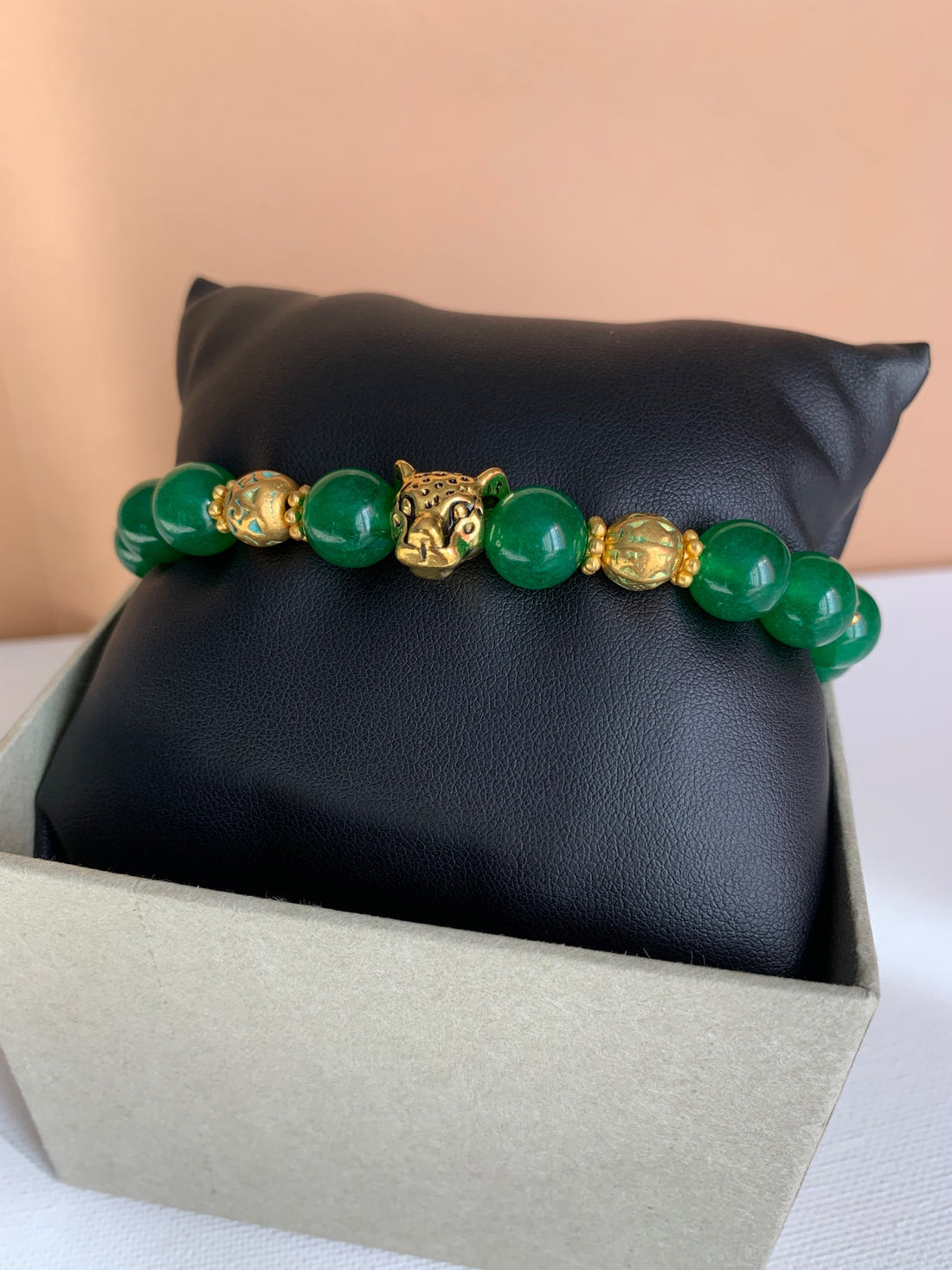 Abundance. Creativity. Positivity. This bracelet is madeΒ of a green Quartz stone. Accented with golden disks....
