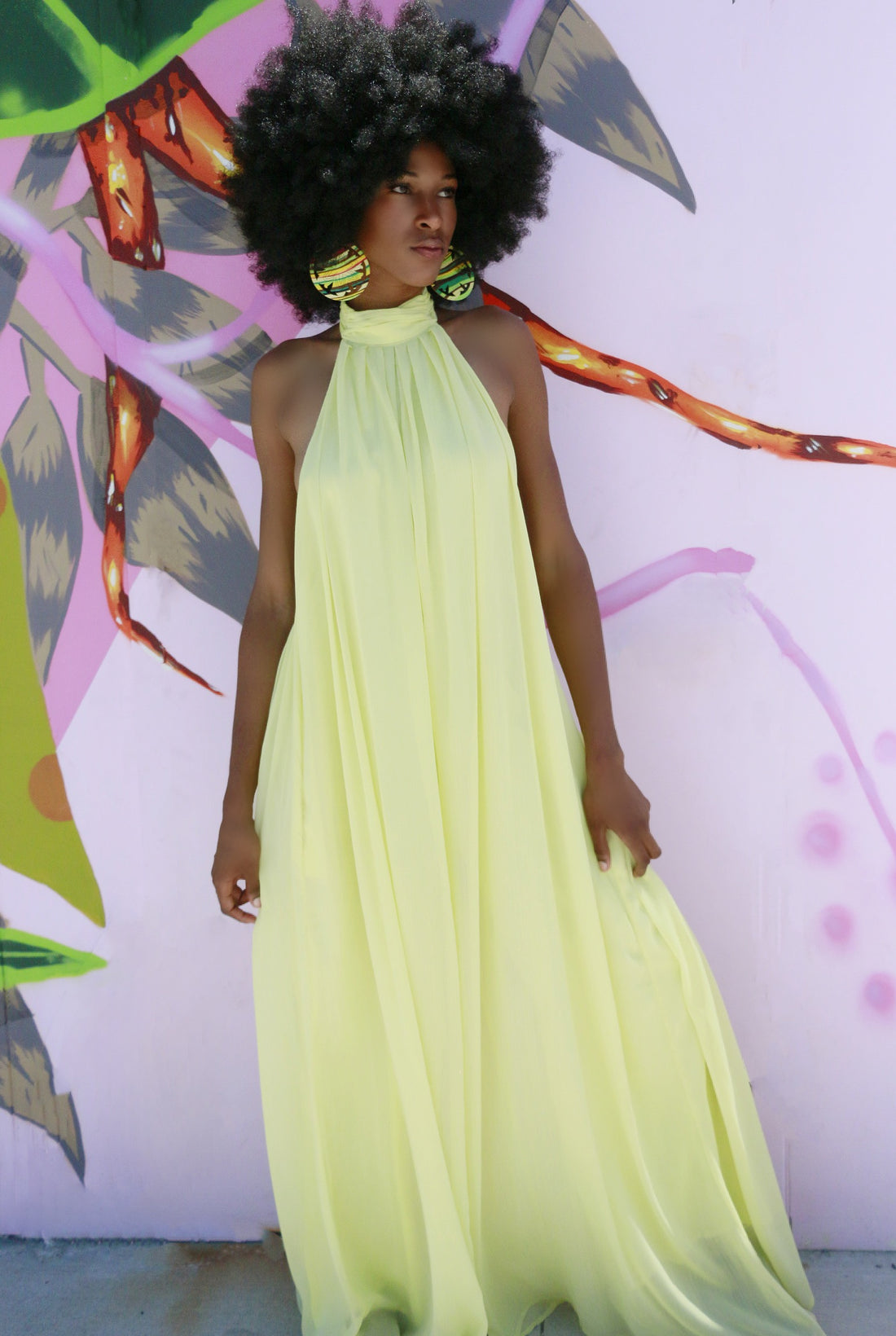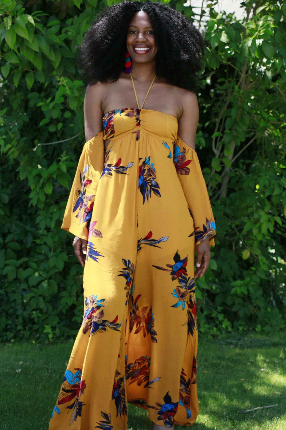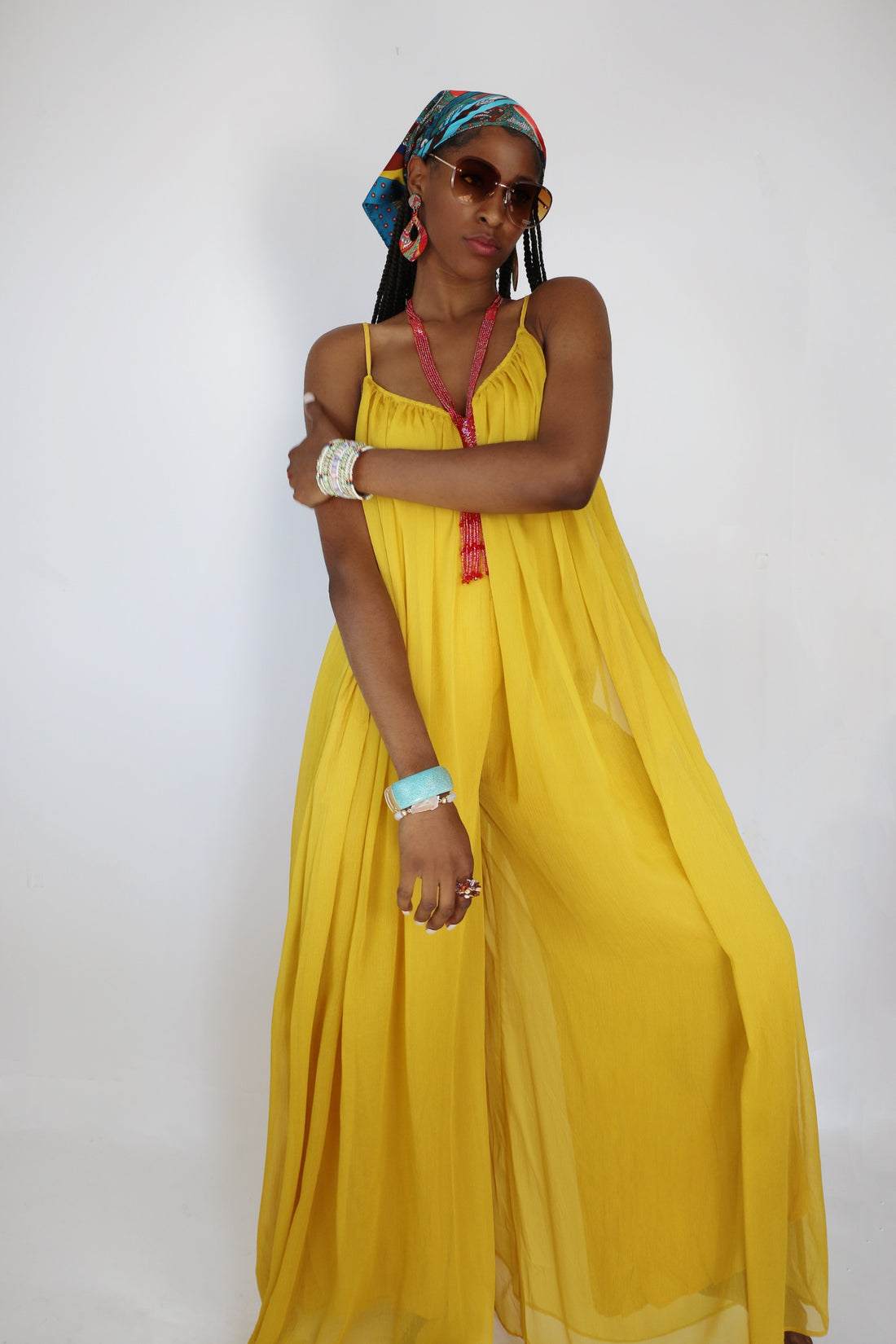 Radiant confidence with this long flowy jumpsuit. She's a light, summer yellow that contrast beautifully...