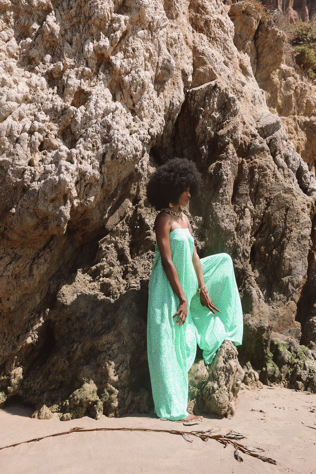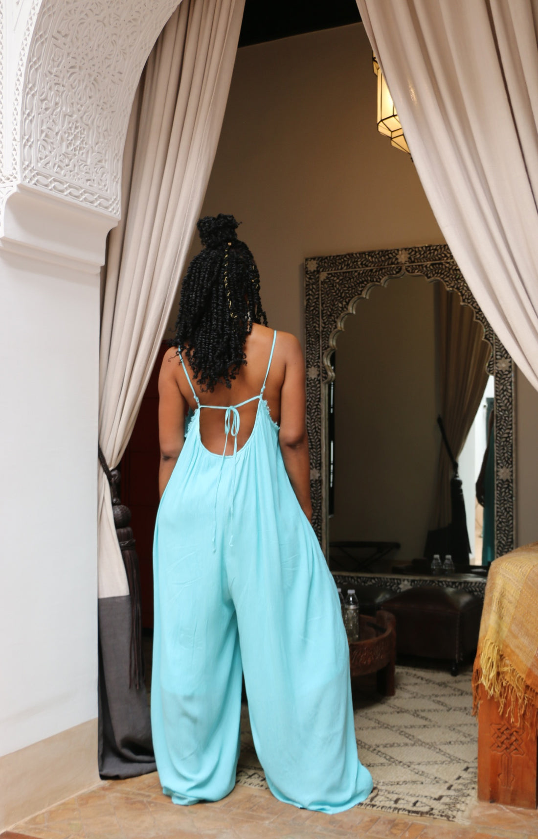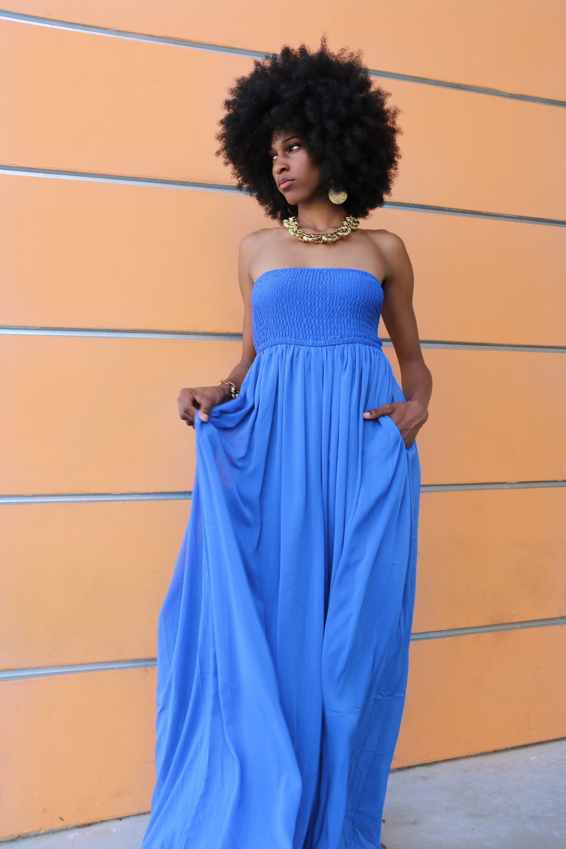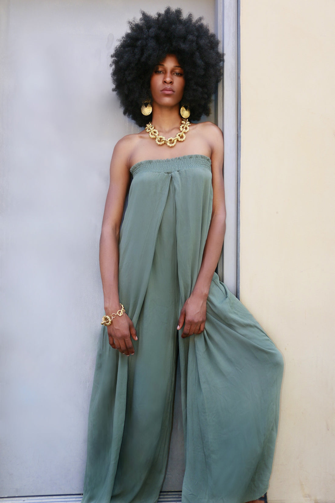 Radiant confidence with this long flowy jumpsuit. She's a light, summer yellow that contrast beautifully...