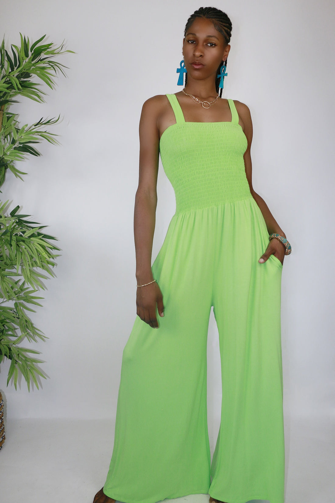 Keep it casual with this bright lime, jumpsuit. The smocked waist design is stretchy and...
