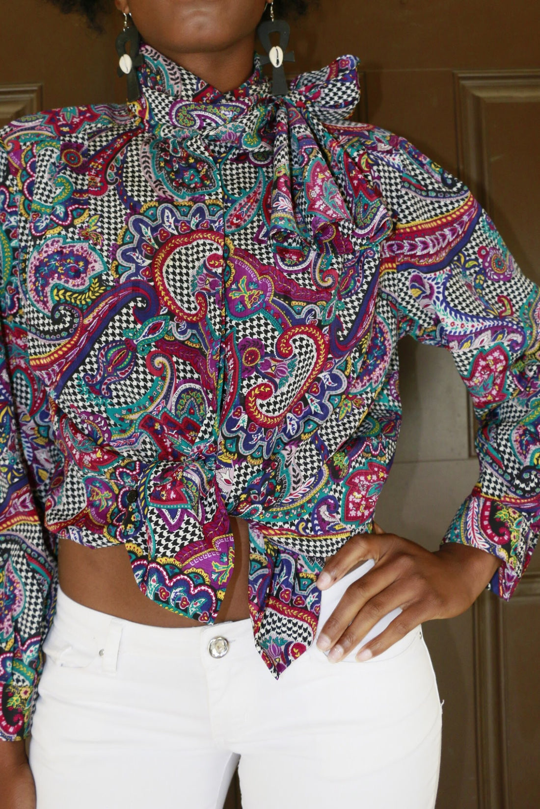 Fun and festive Blouse! Button up with a sash that ties at the neck.Β 1980βs...