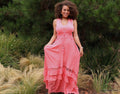 Gorgeous, tea leaf color dress with touches of lace and gathered layers that trace the bottom. Light weight, and flowy with adjustable straps for a personalized it and comfort.