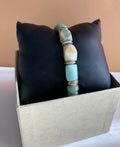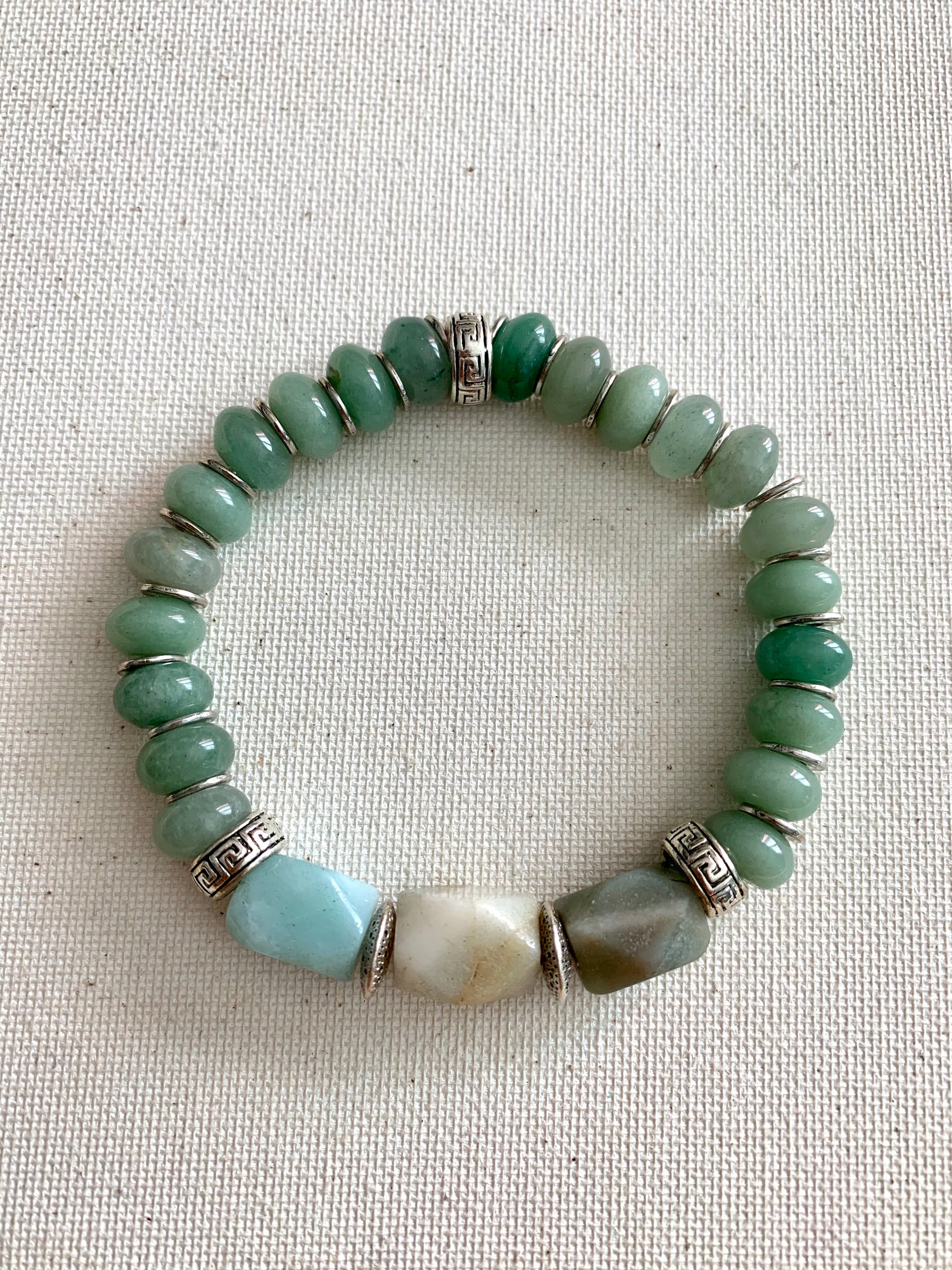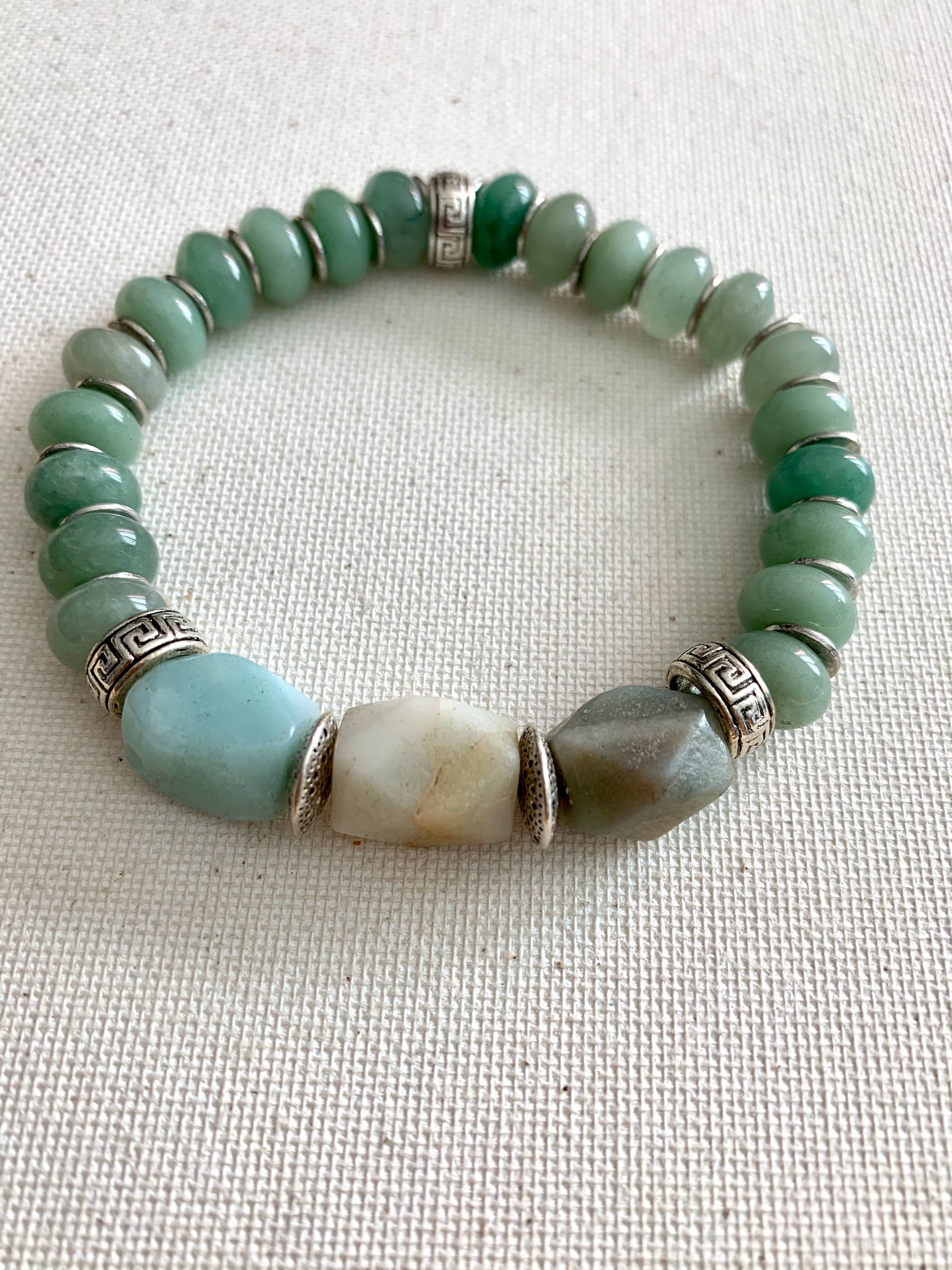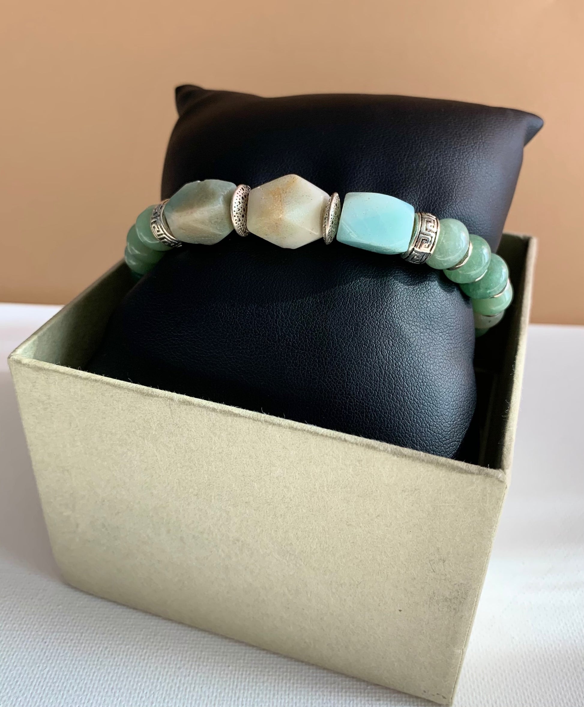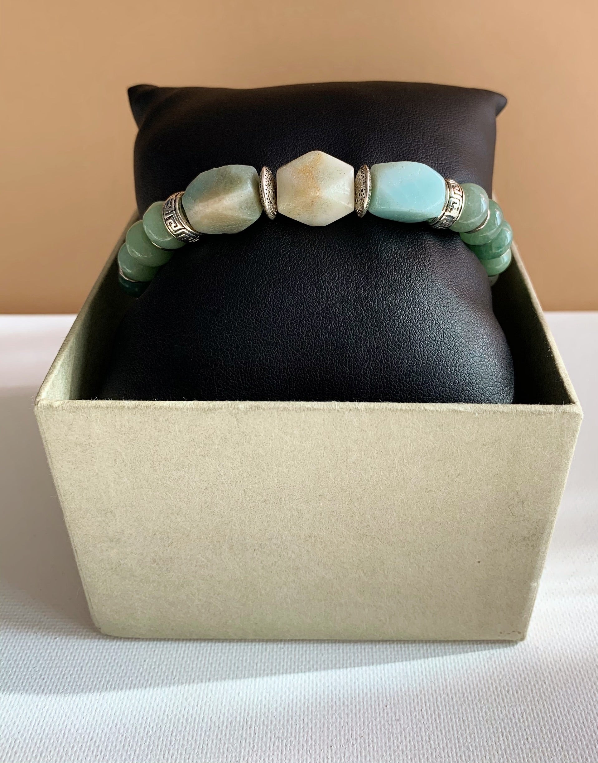 This bracelet is made of a unique cut amazonite stones. It features a smooth, oval cut stone with silver colored disks. Features an elastic band that’s easy to slide on.