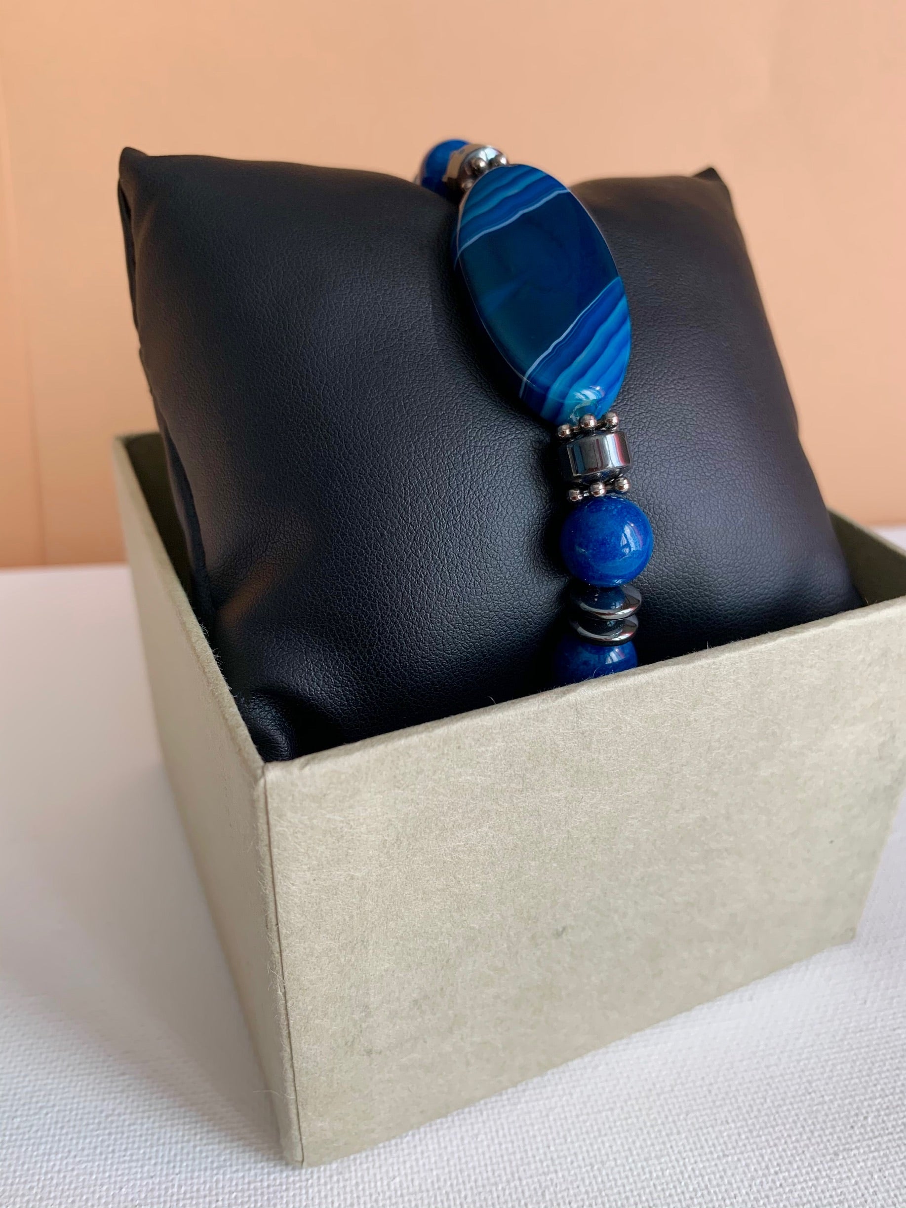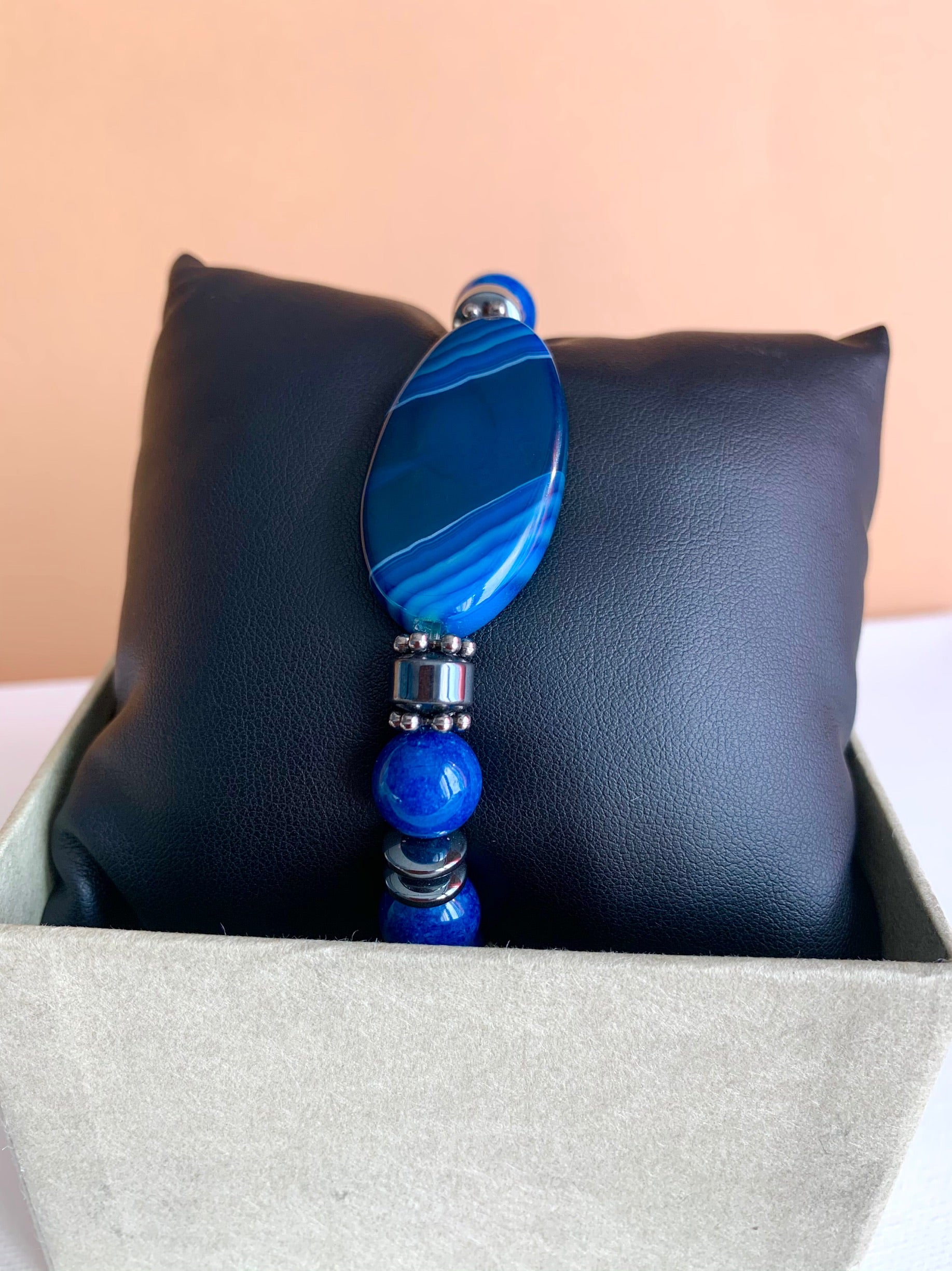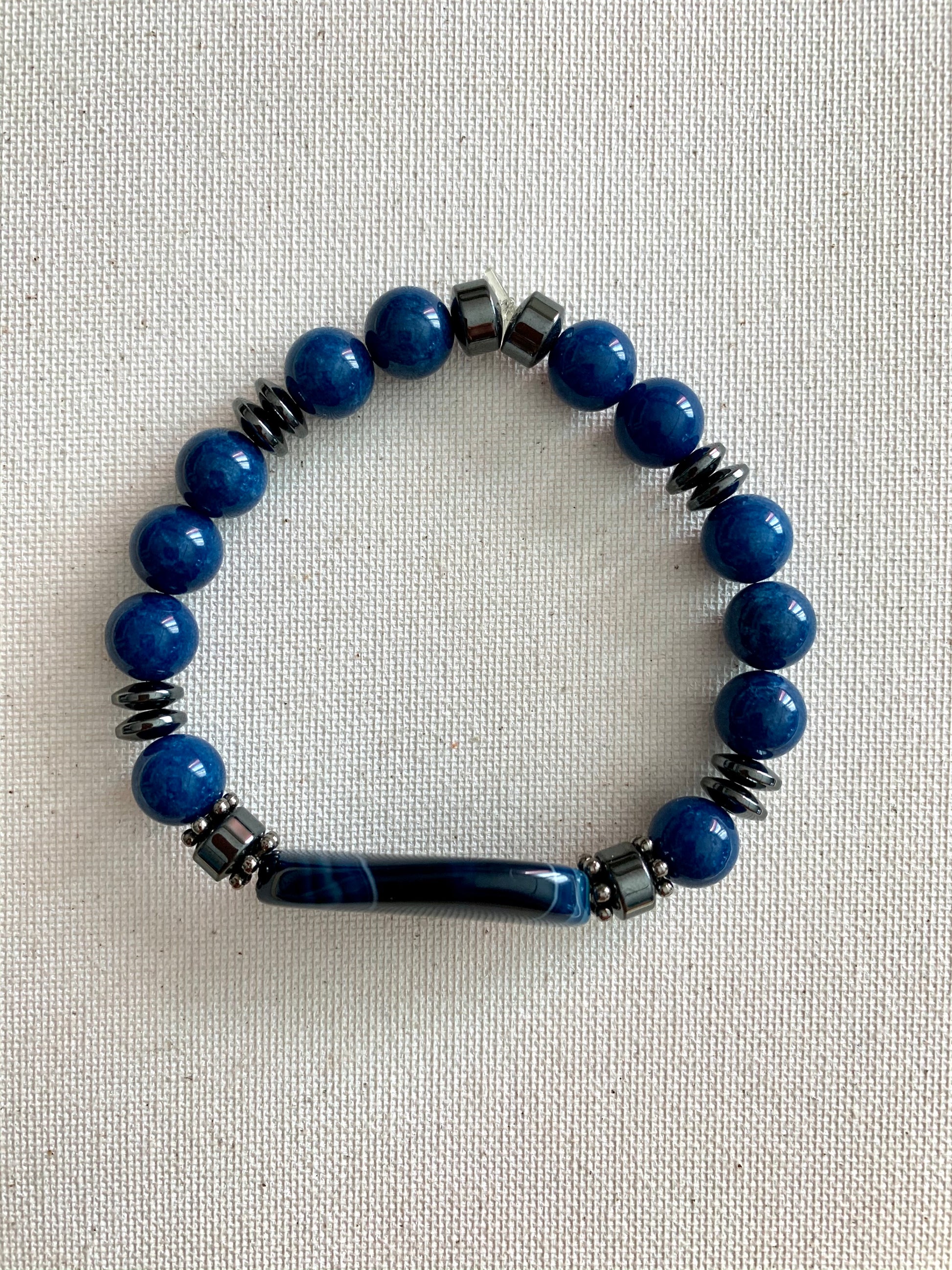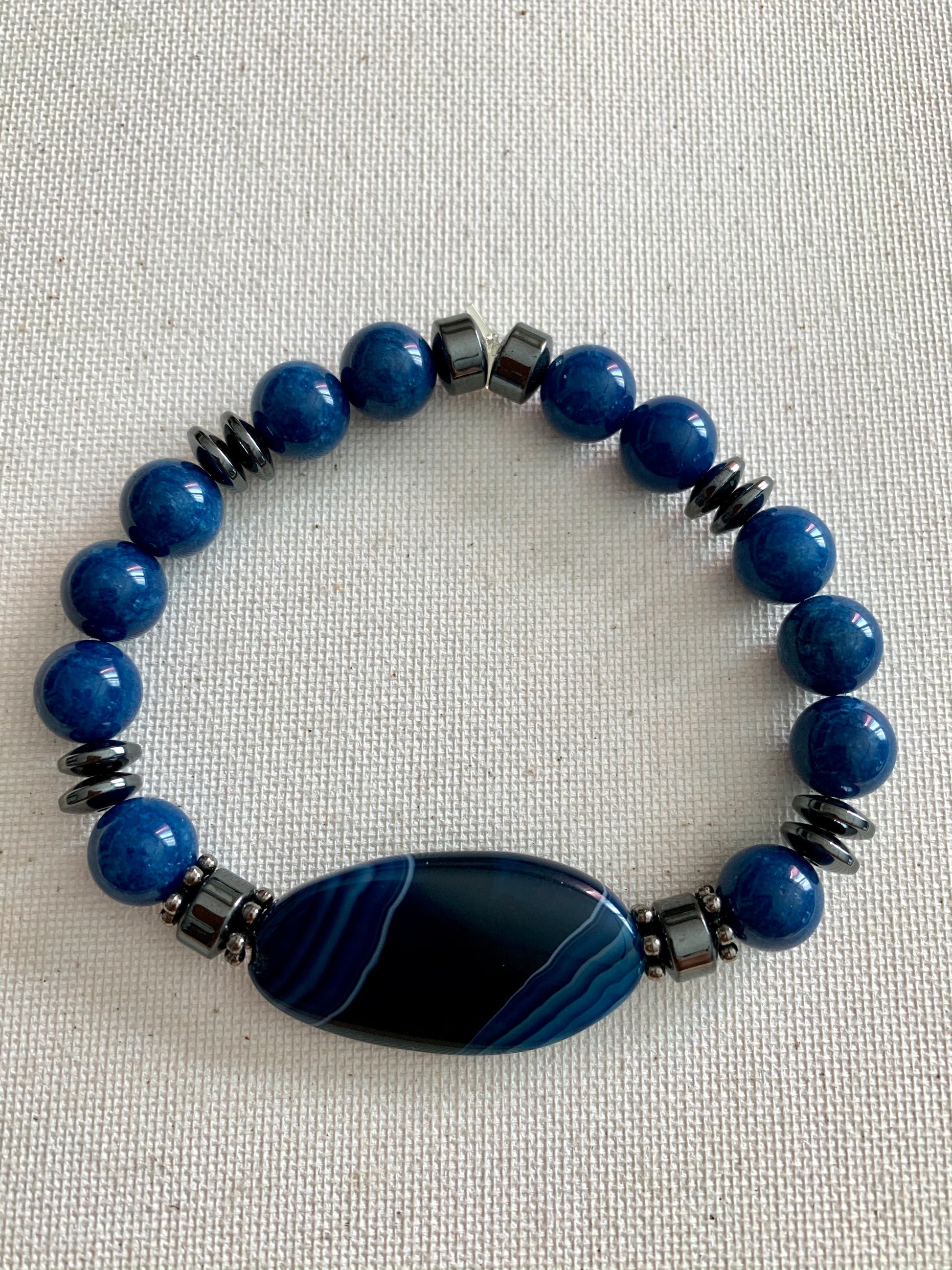This bracelet is made of a blue agate stone beads and hematite accent beads. Features an elastic band that’s easy to slide on.