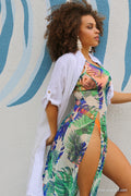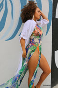 Soft, stretchy mesh dress with a tropical print. 2 high splits along each thigh.