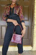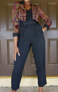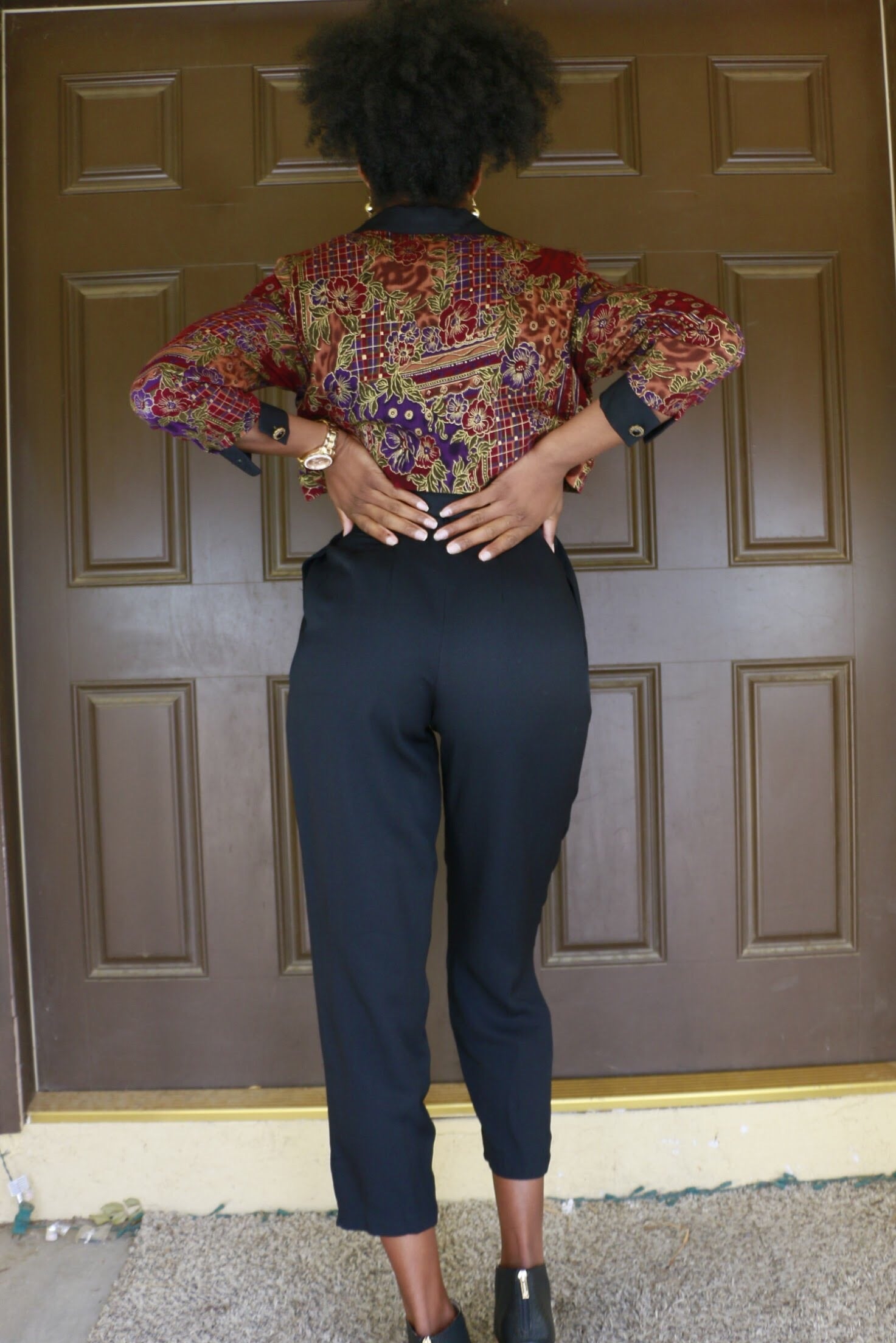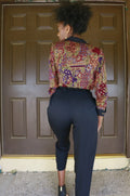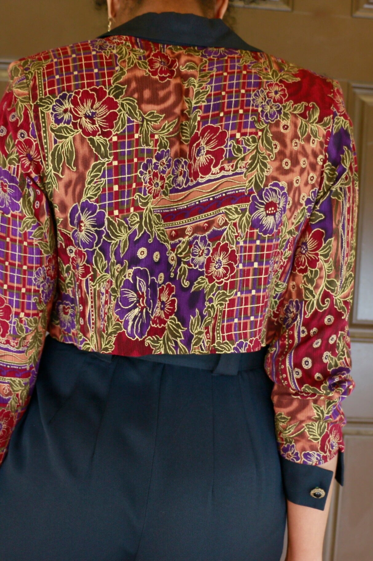 Cropped jacket jumpsuit with rich colors and floral pattern that’s superbly embossed in gold.