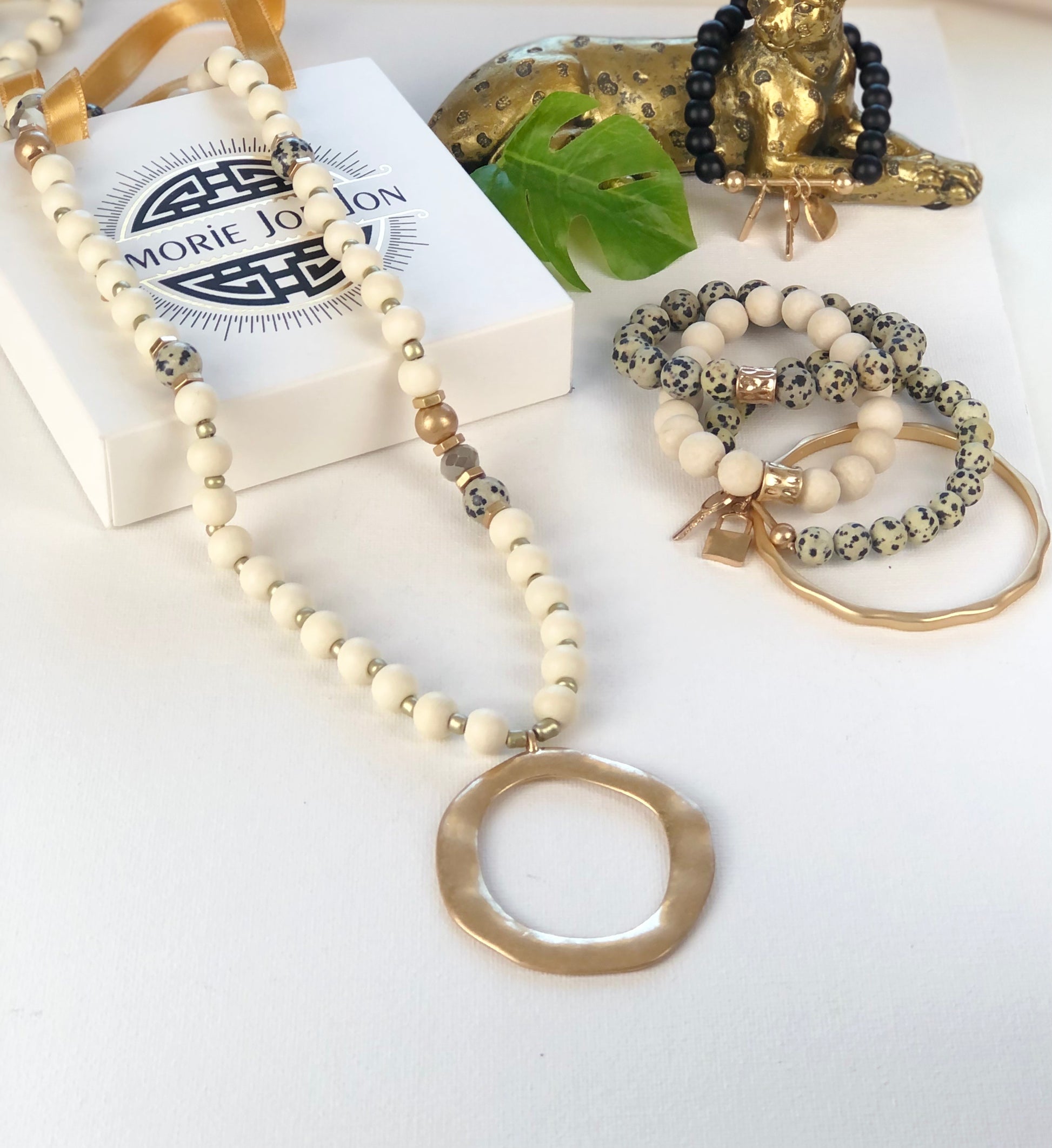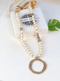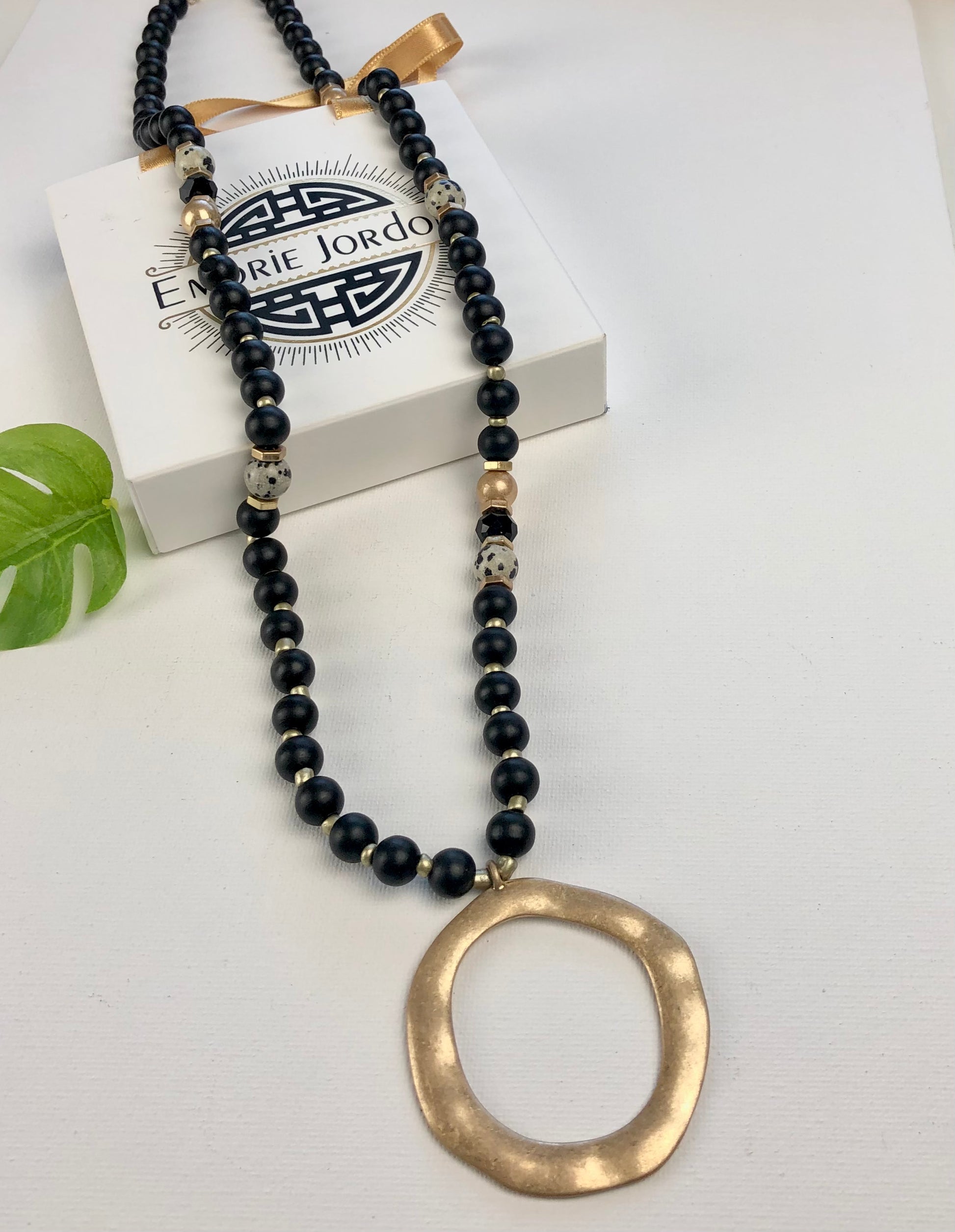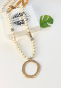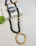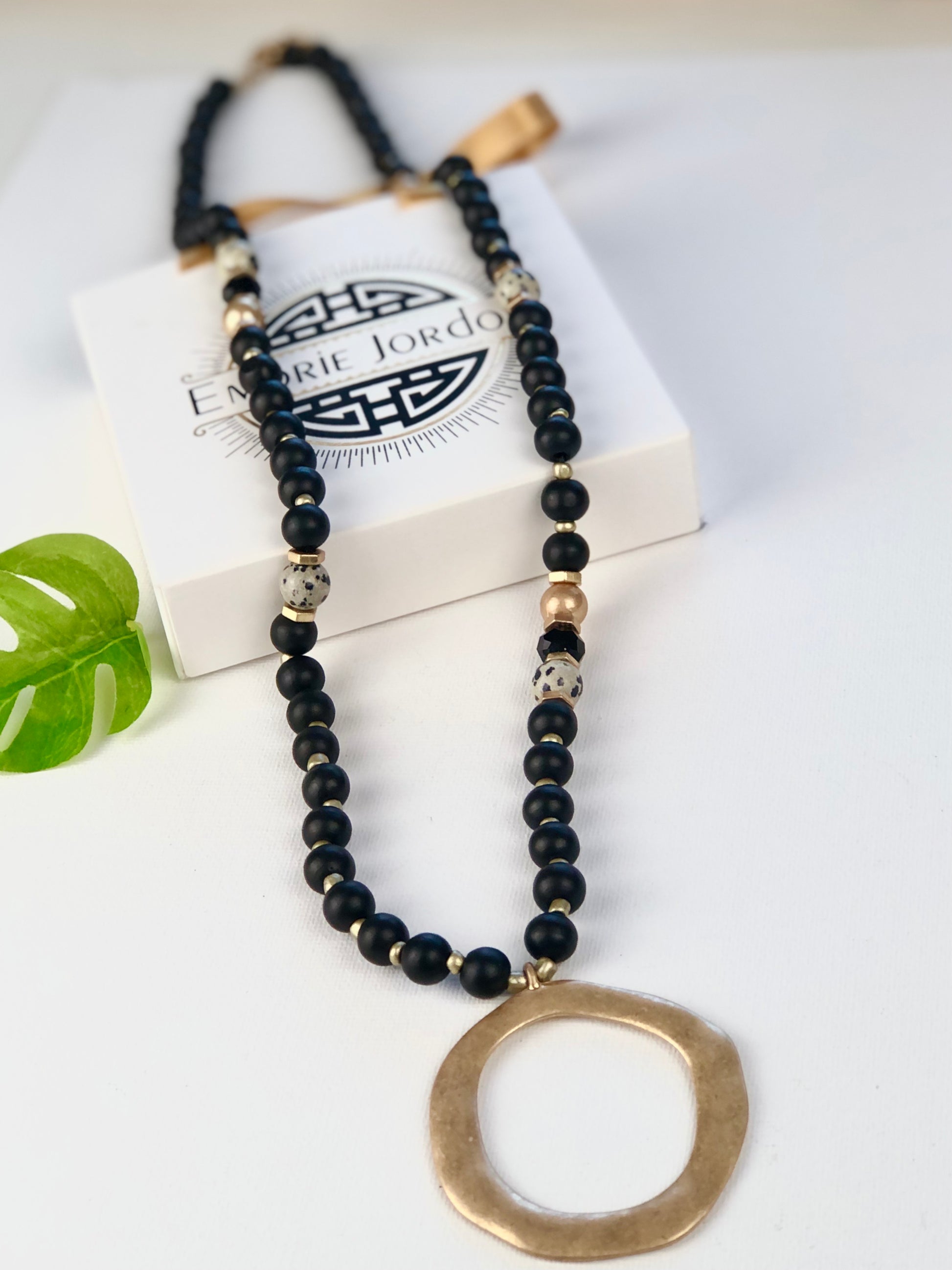Feel like a divine diva in this beautiful statement necklace. Adorned with wood beads, and accented with Dalmatian stones, this piece comfortably falls beautifully down the front torso.