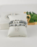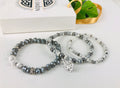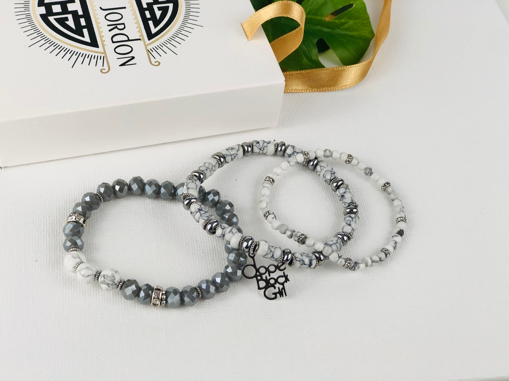 Feel like a chic, modern empress with this statement stack. The neutral gray and white Howlite stone set feels superior. Dope Black Girl charm is made of stainless steel.