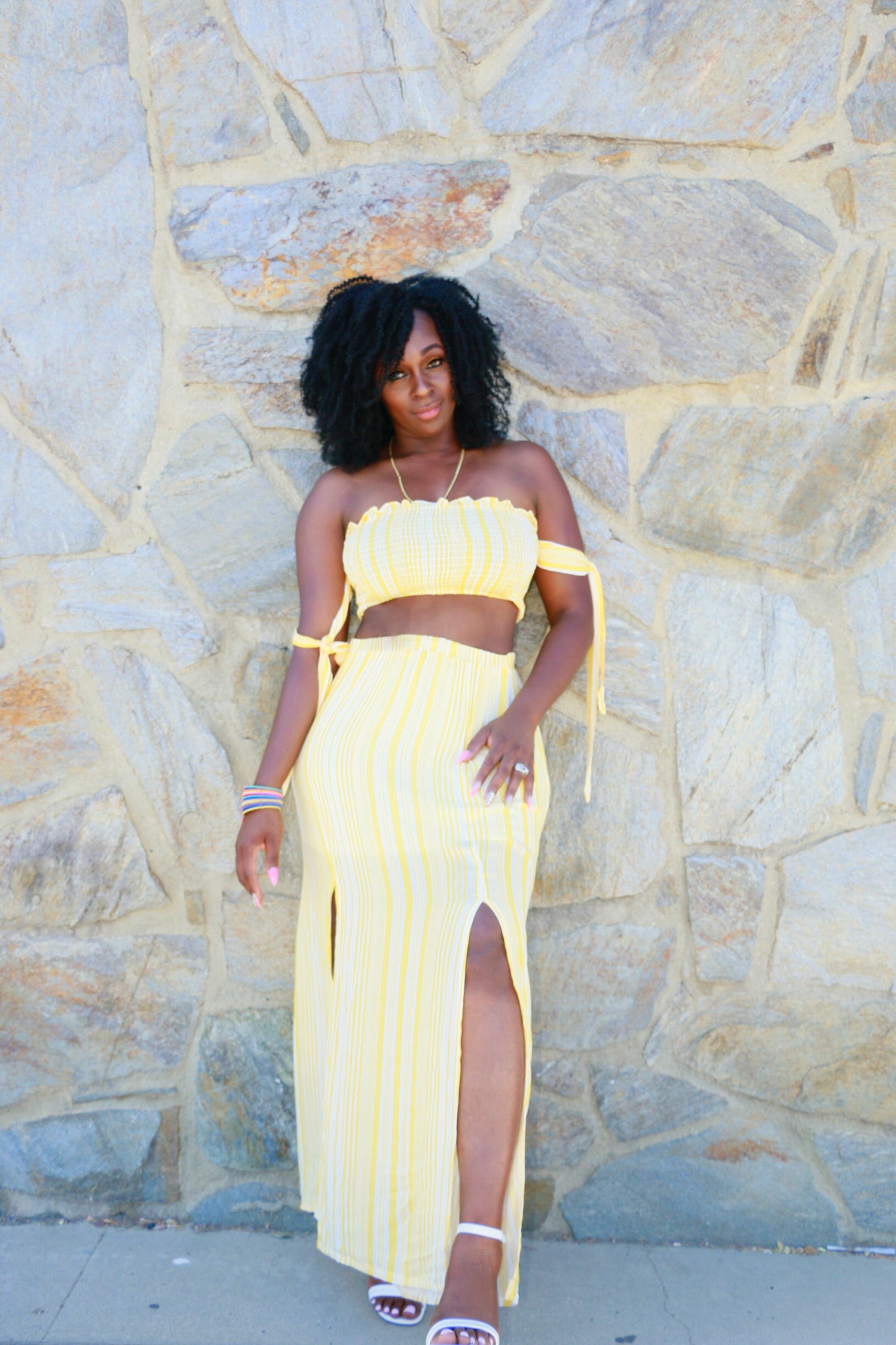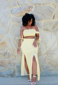 Beautiful 2 pc yellow and white striped set! Dual splits up the thighs with elastic waist that makes a comfortable fit!!