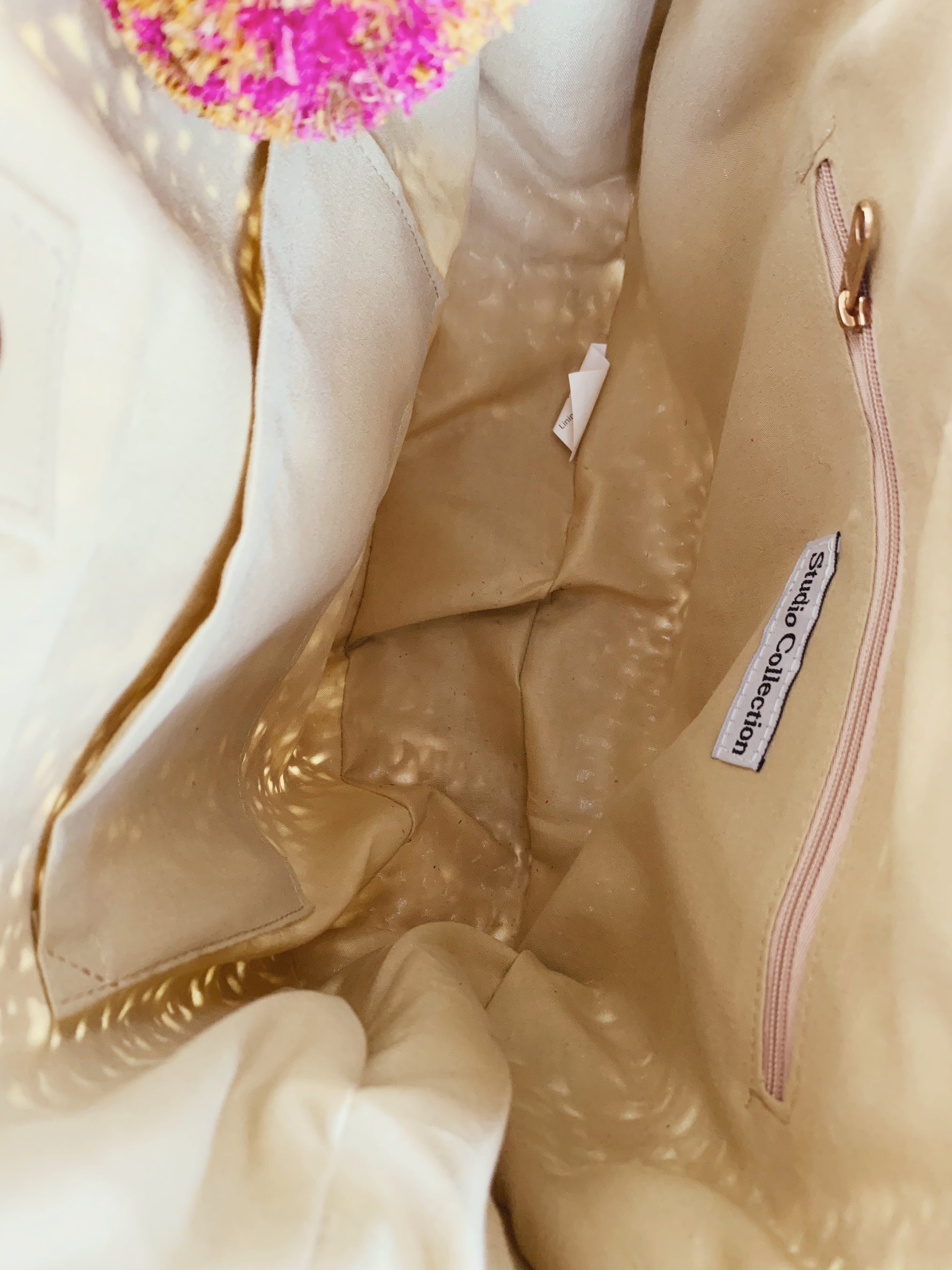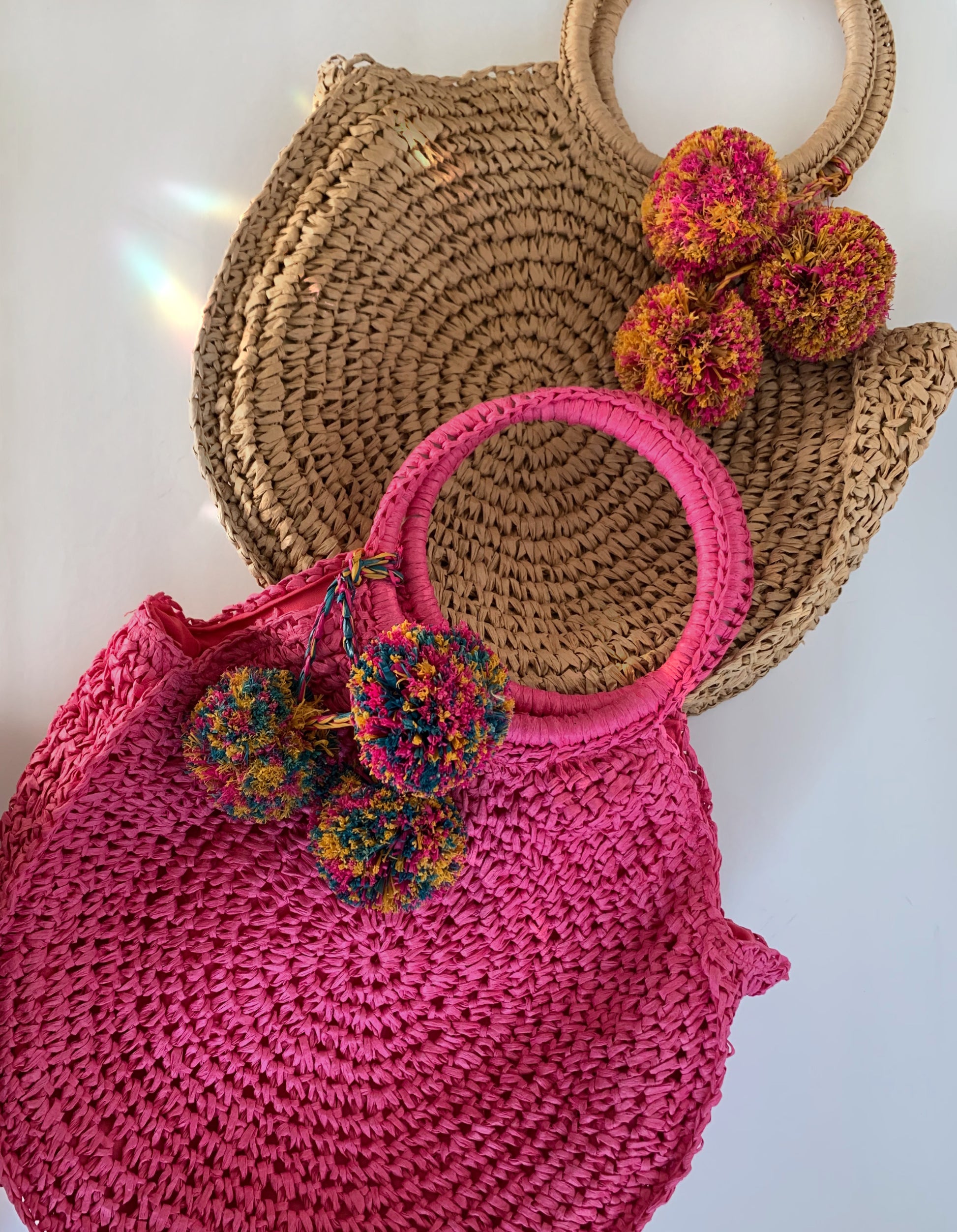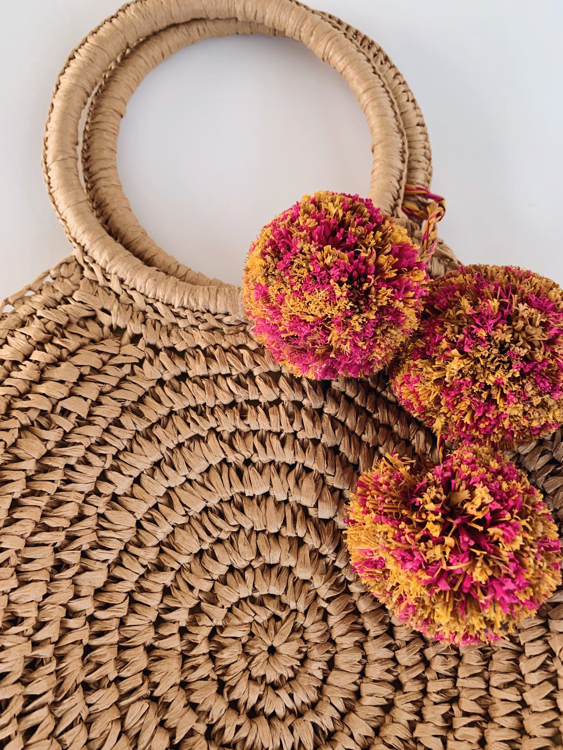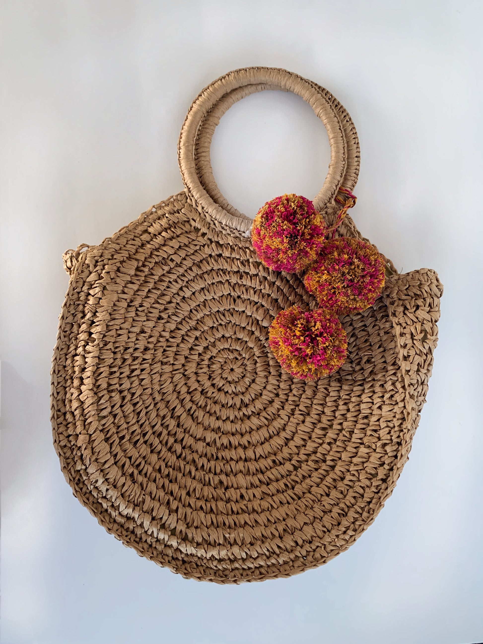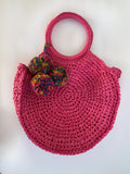 Bohemian tote with round handles. Large tassel ball decor. Eco friendly handbag made of paper and cotton lining.