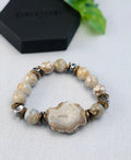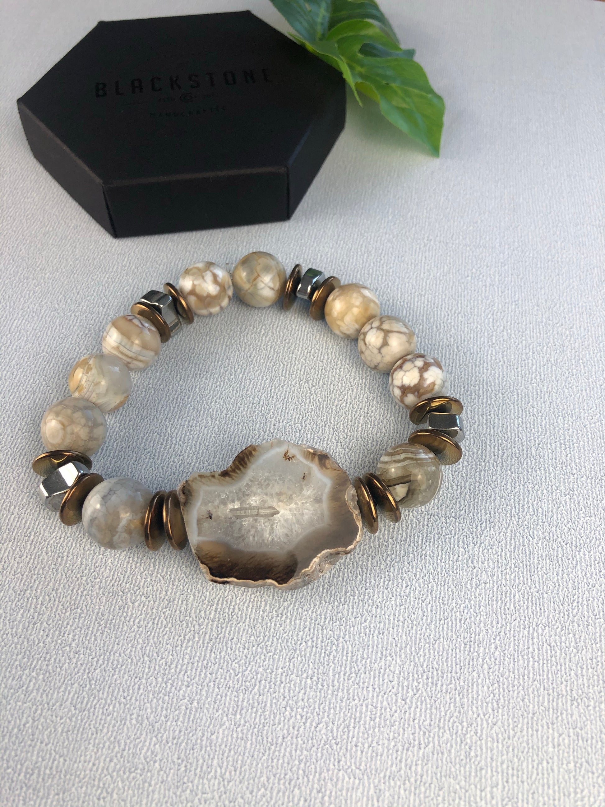 uniquely cut white/tan mixed agate stone flanked with silver and gold hematite stone disks.