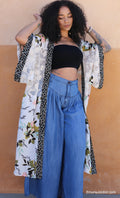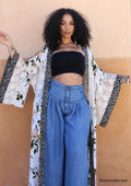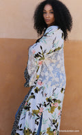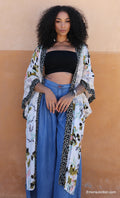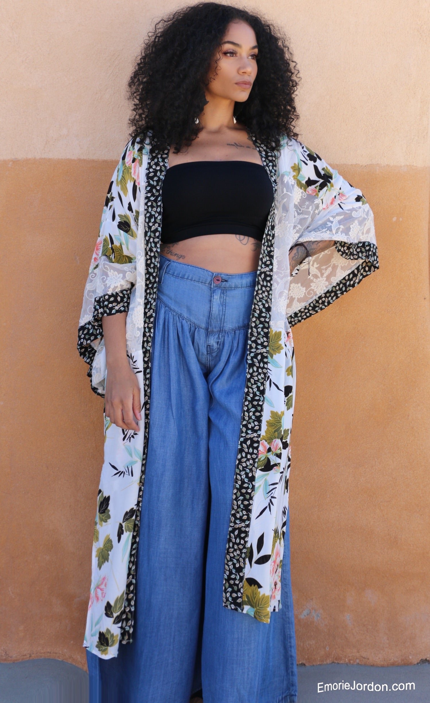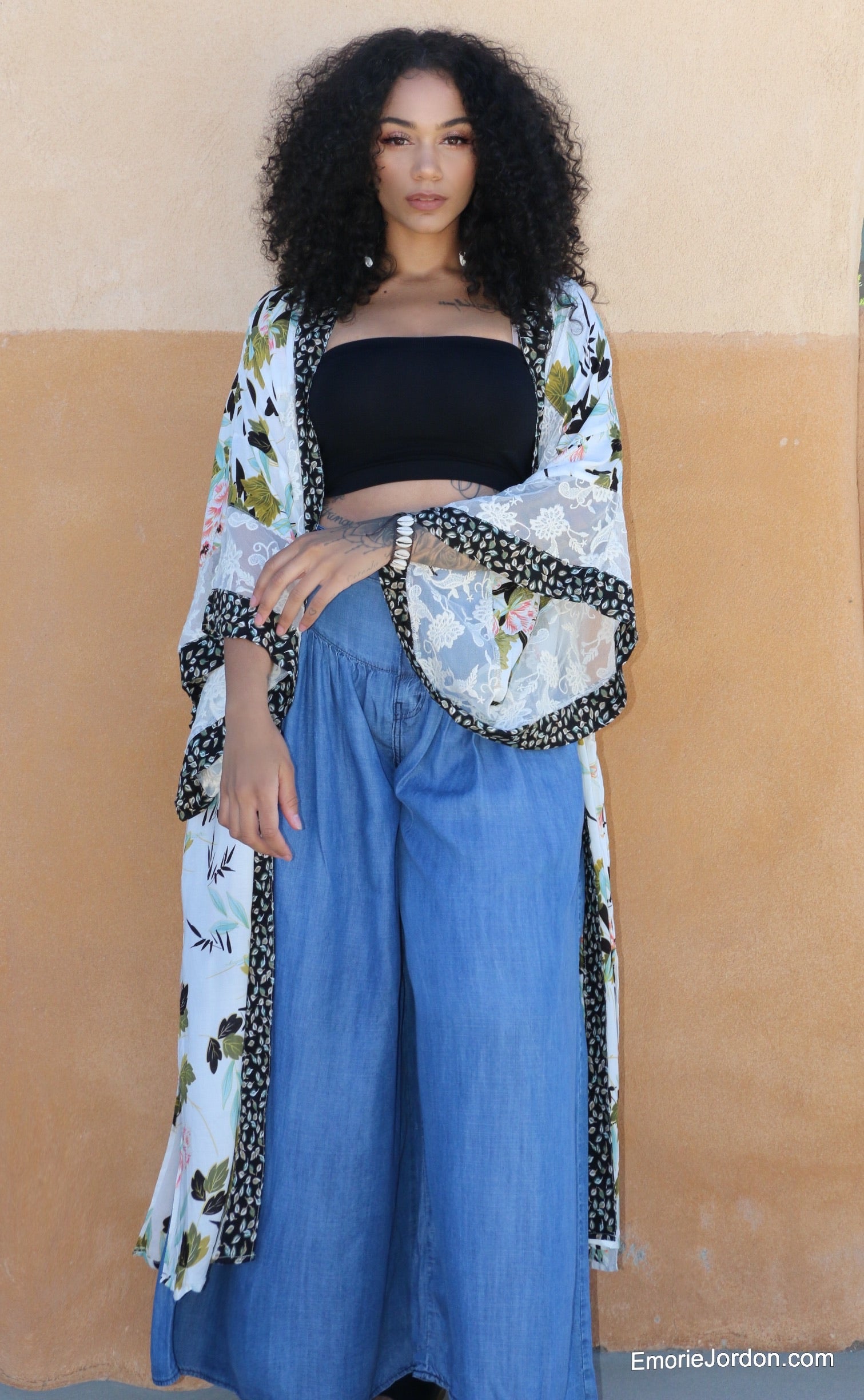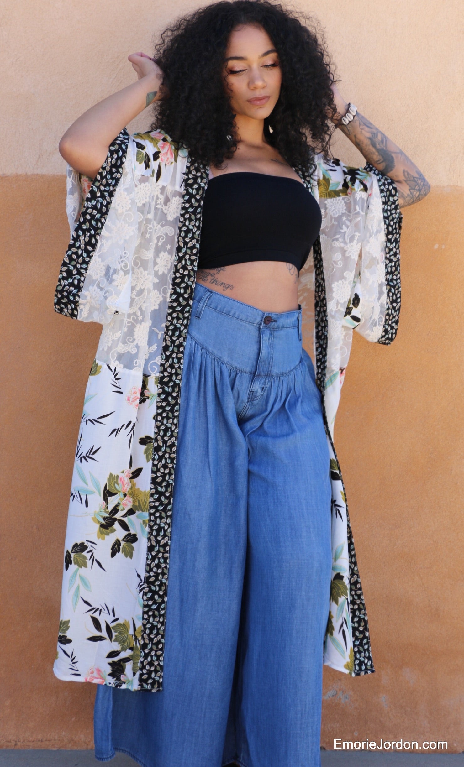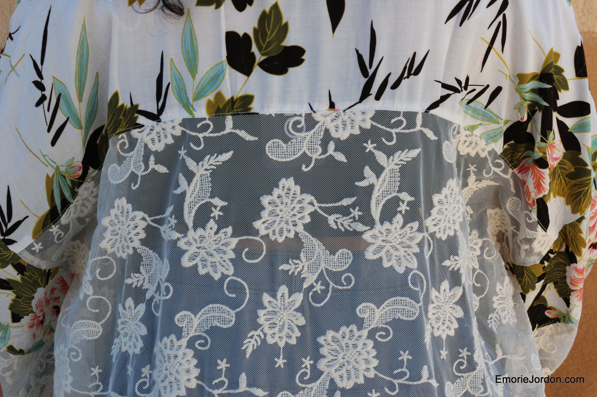 There’s a timeless beauty to this kimono. Large square sleeves and dual patterns with a peek of lace in back.