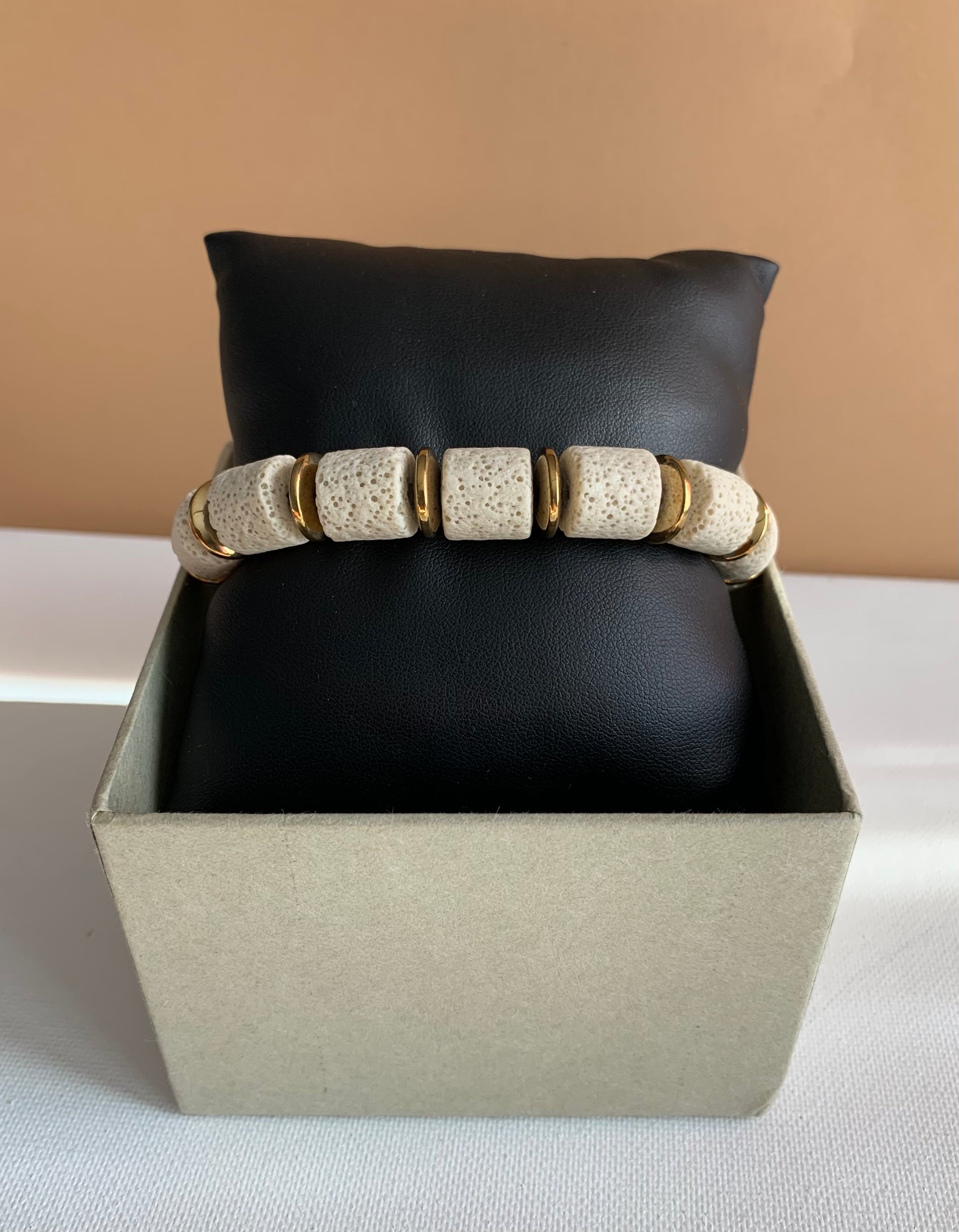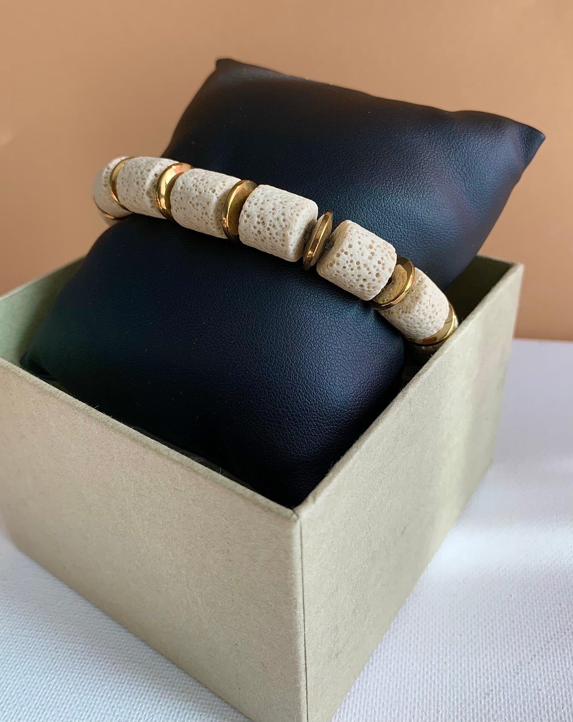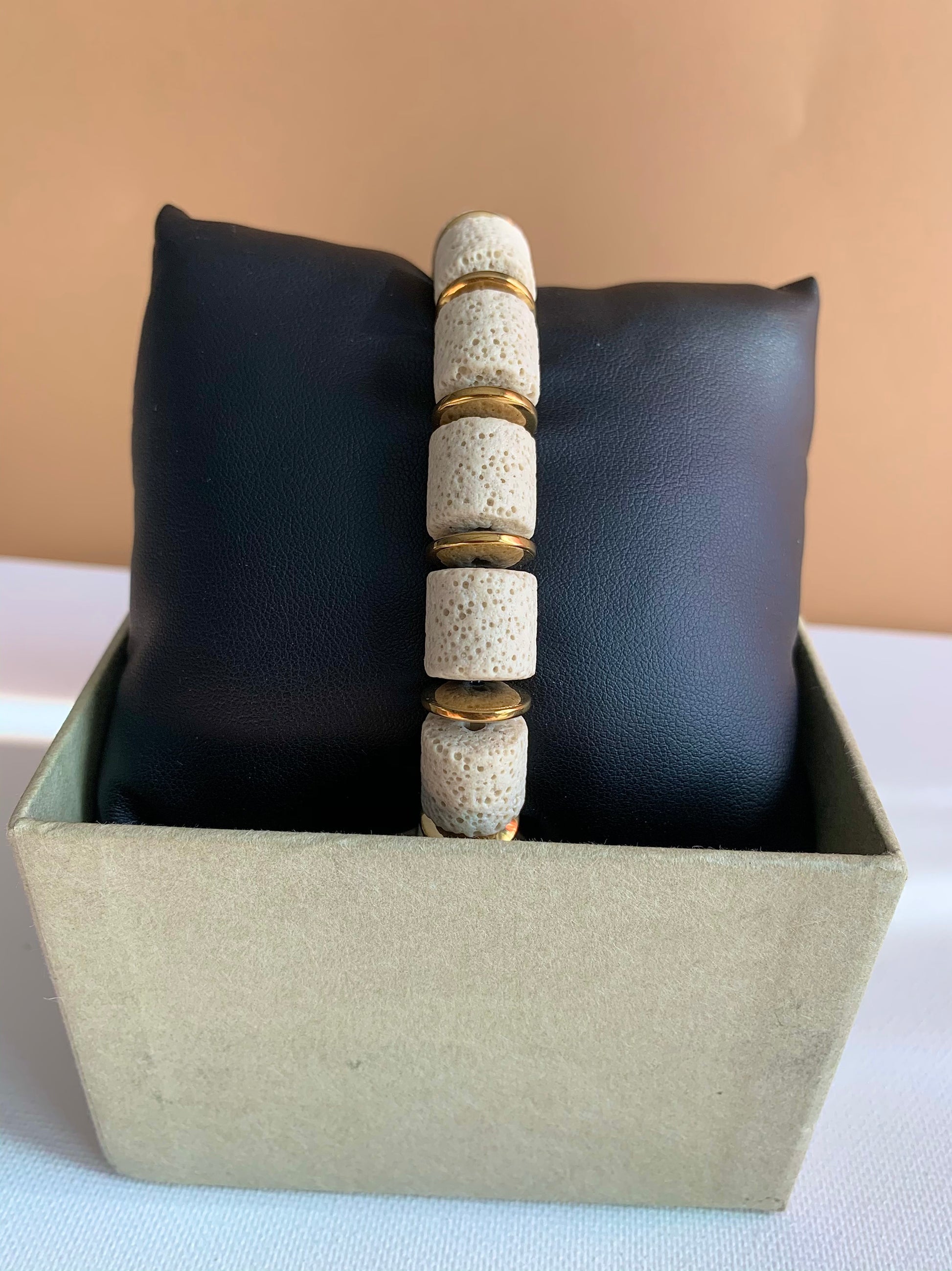 This bracelet is made of a lava rock stones. It features a smooth, oval cut stone with gold metallic hematite disks. Features an elastic band that’s easy to slide on.