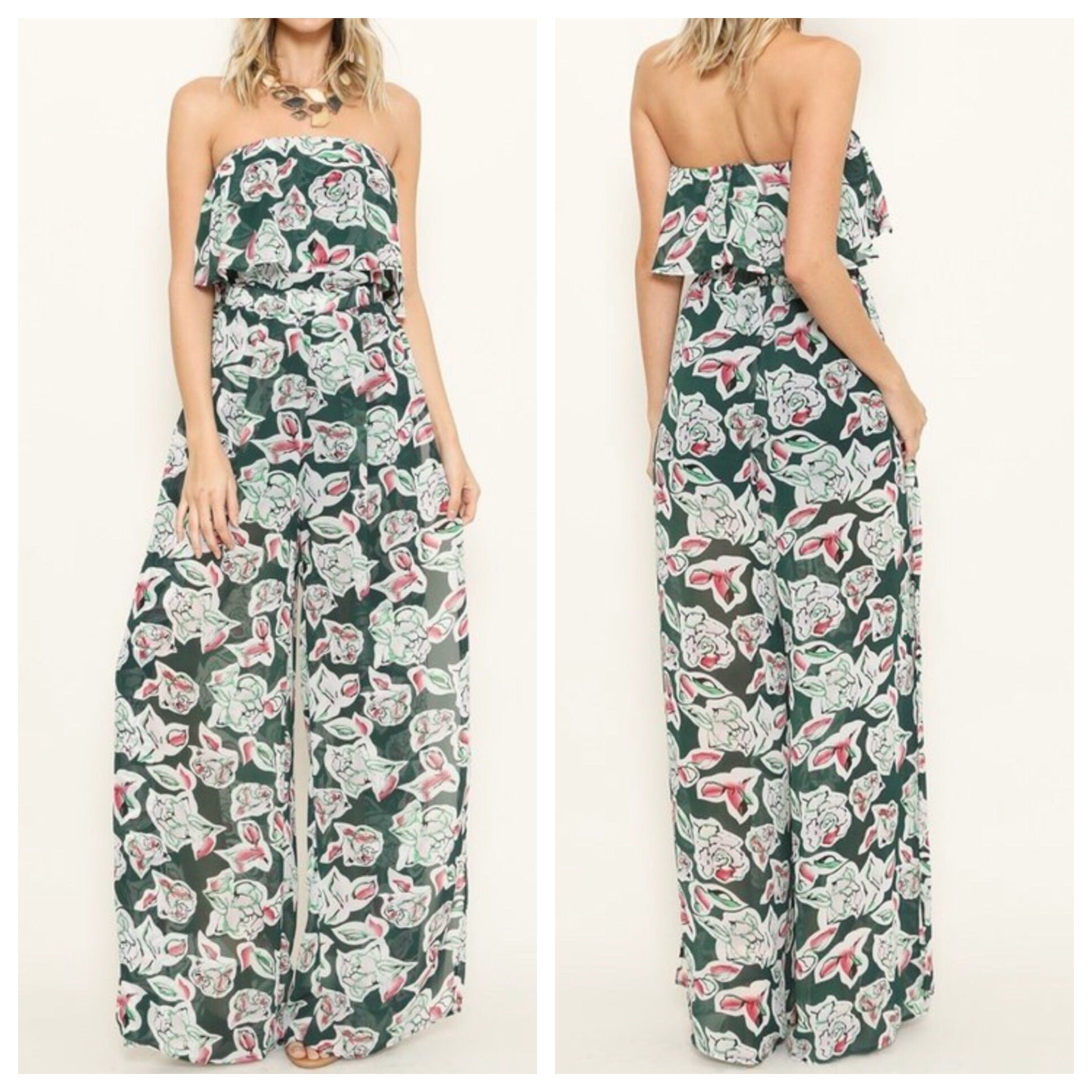 Easy, flowing chiffon jumpsuit with 2 long slits up the leg. Hunter green shorts underneath.