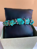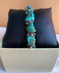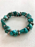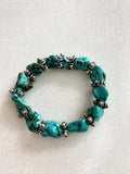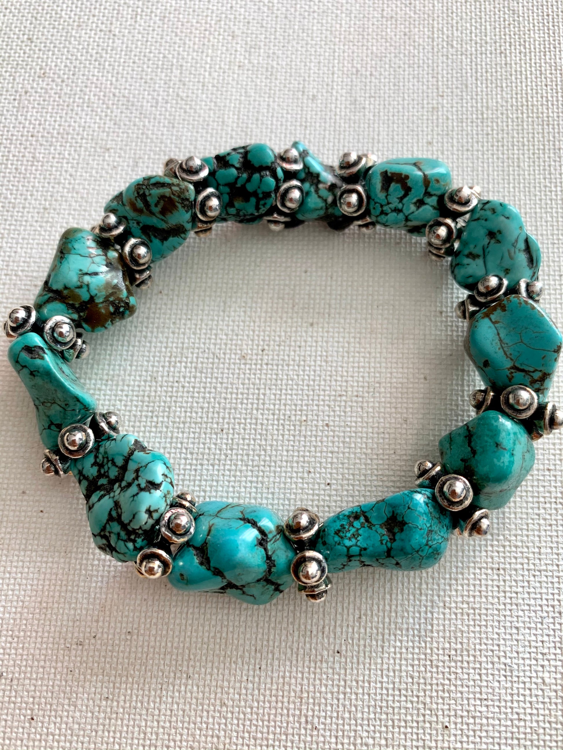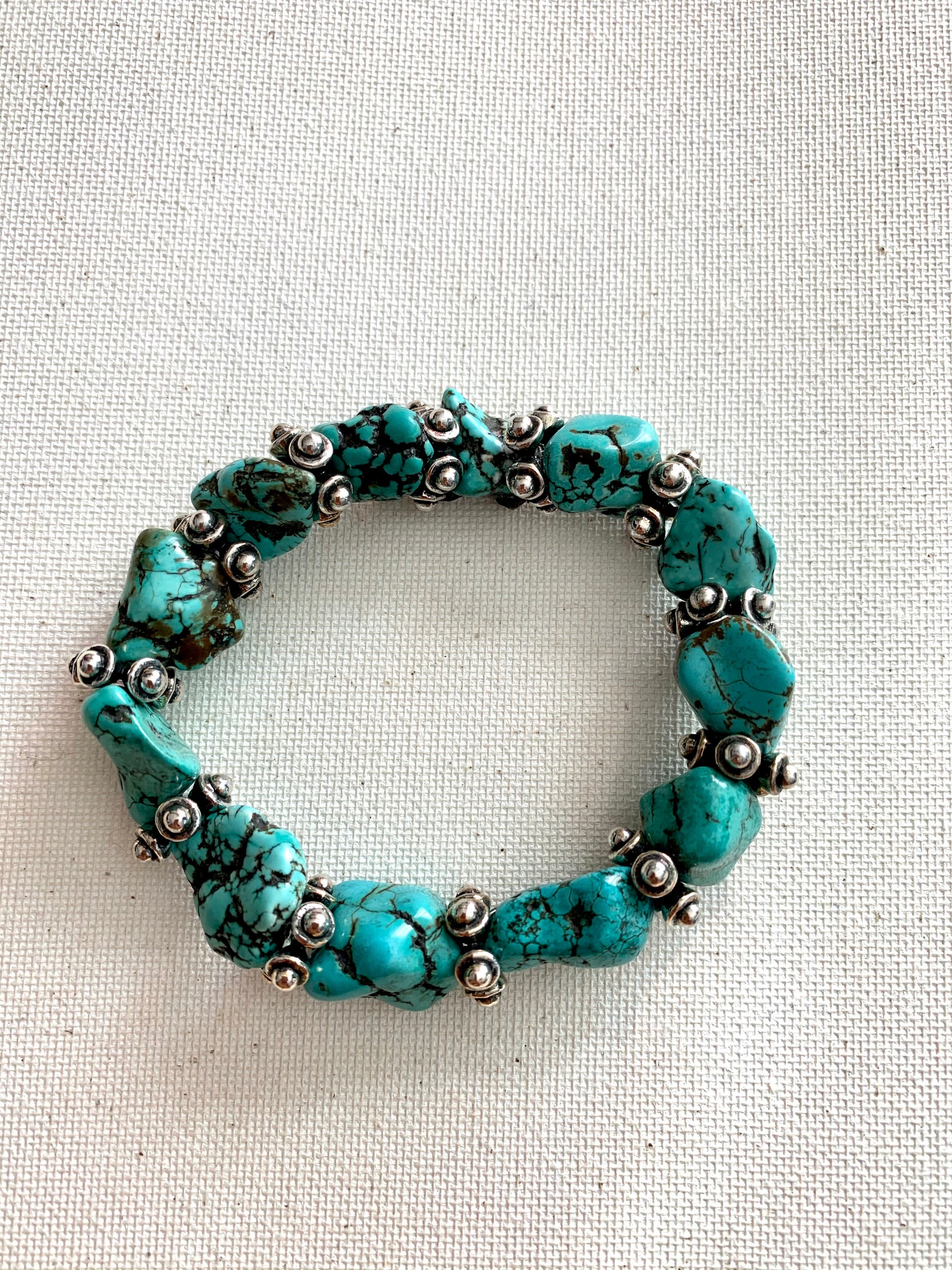 This bracelet is made of a turquoise stone beads and silver alloy metal accent beads. Features an elastic band that’s easy to slide on.