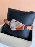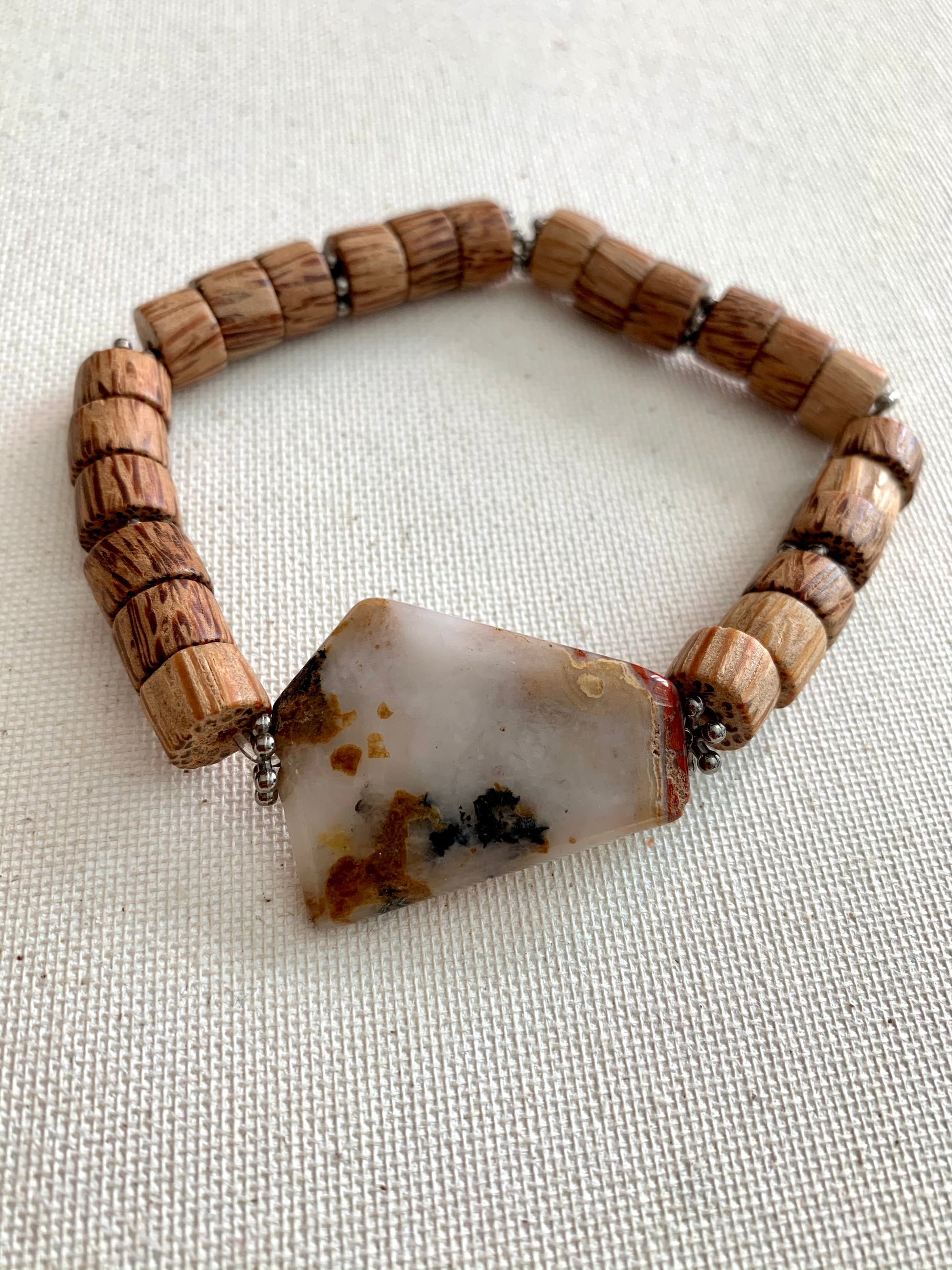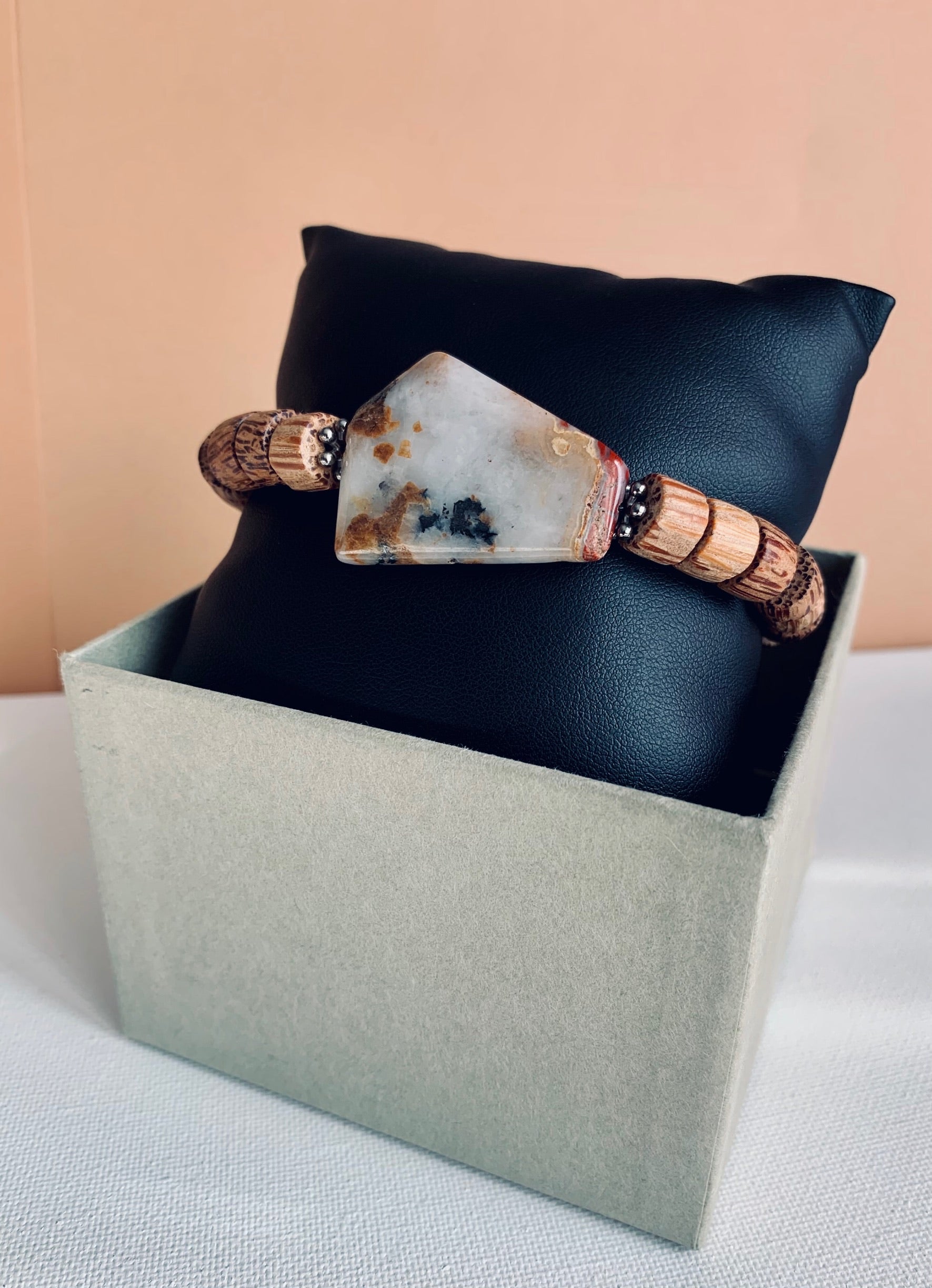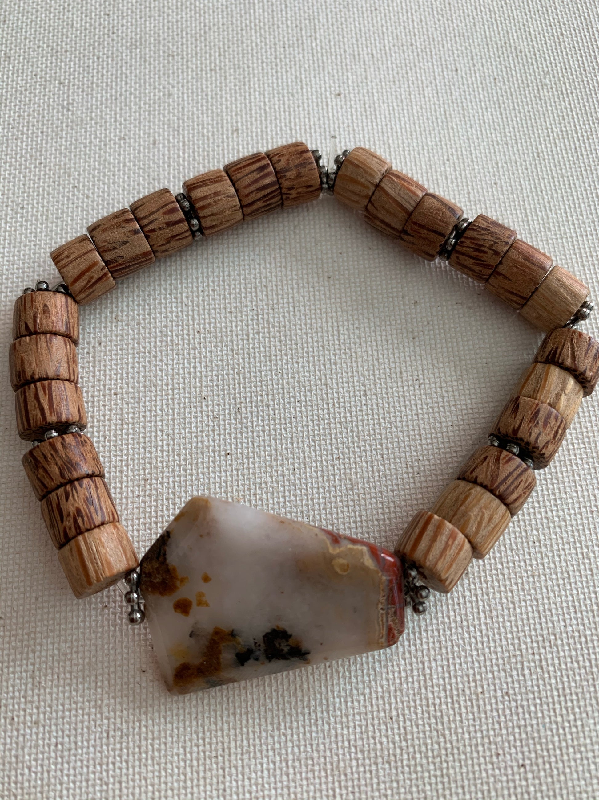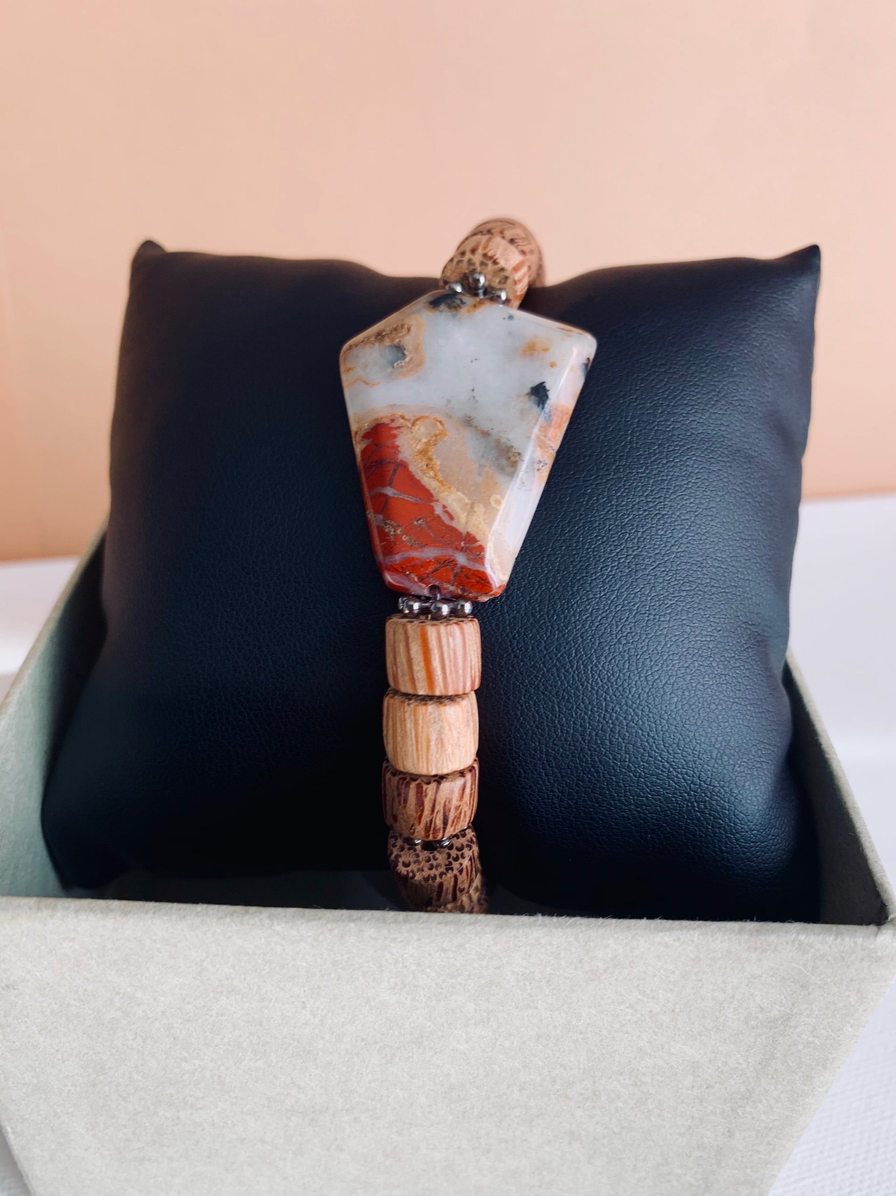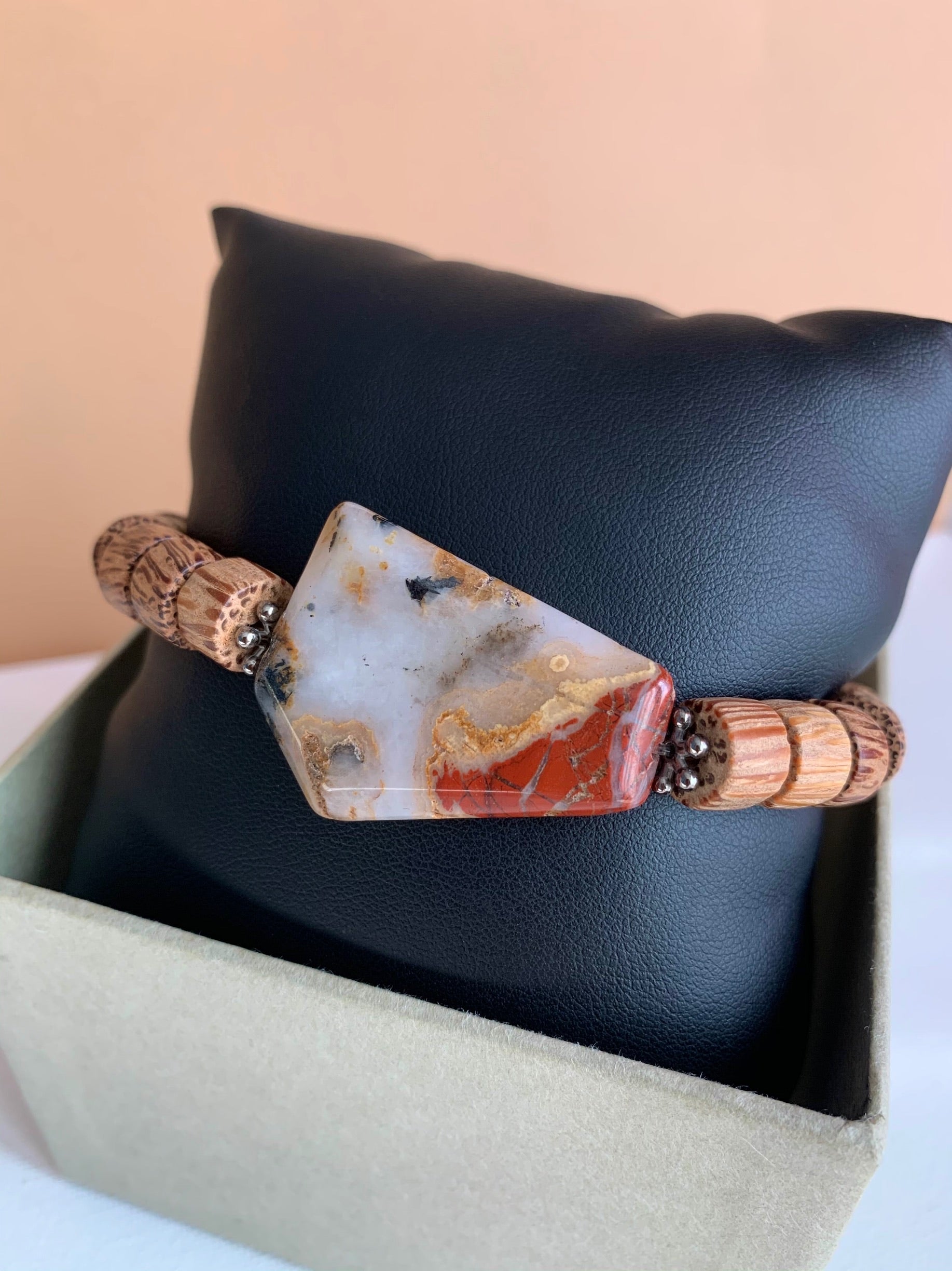 This bracelet is made of red Jasper stones mix. It features a smooth coconut Wood that is flanked by metal accents. Features an elastic band that’s easy to slide on.