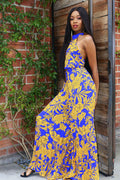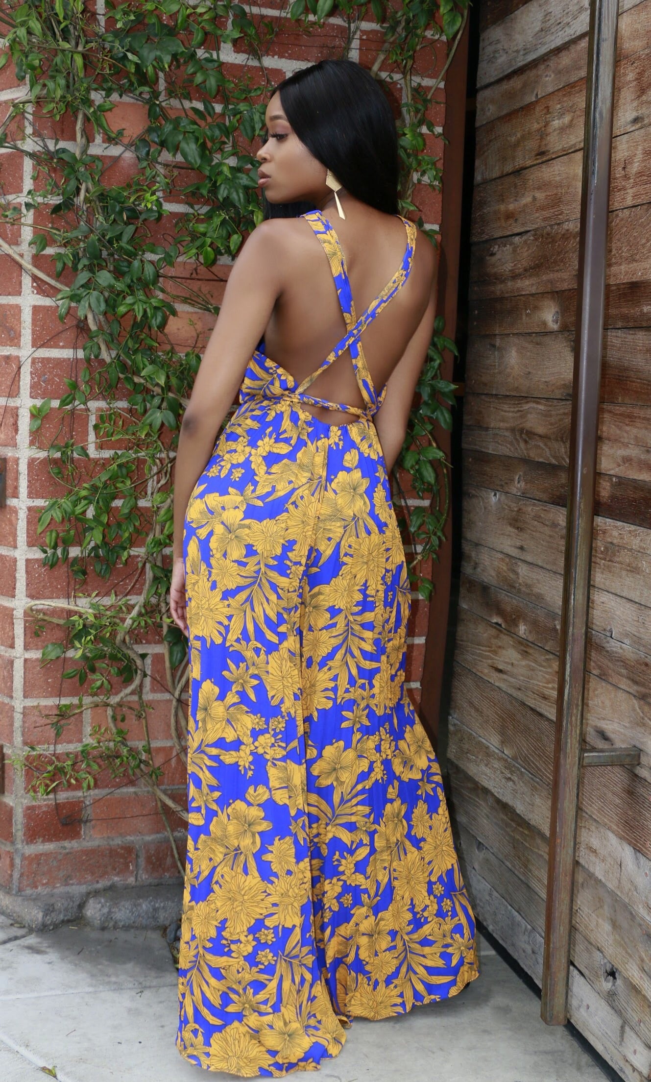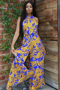 Royal π Blue and Gold pleated one-piece jumpsuit. Beautiful halter design with versatile straps along the back!Β