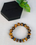 Bold, brown tiger’s eye stone polished bracelet. Unique hexagon cuts flanked with silver hematite stone.