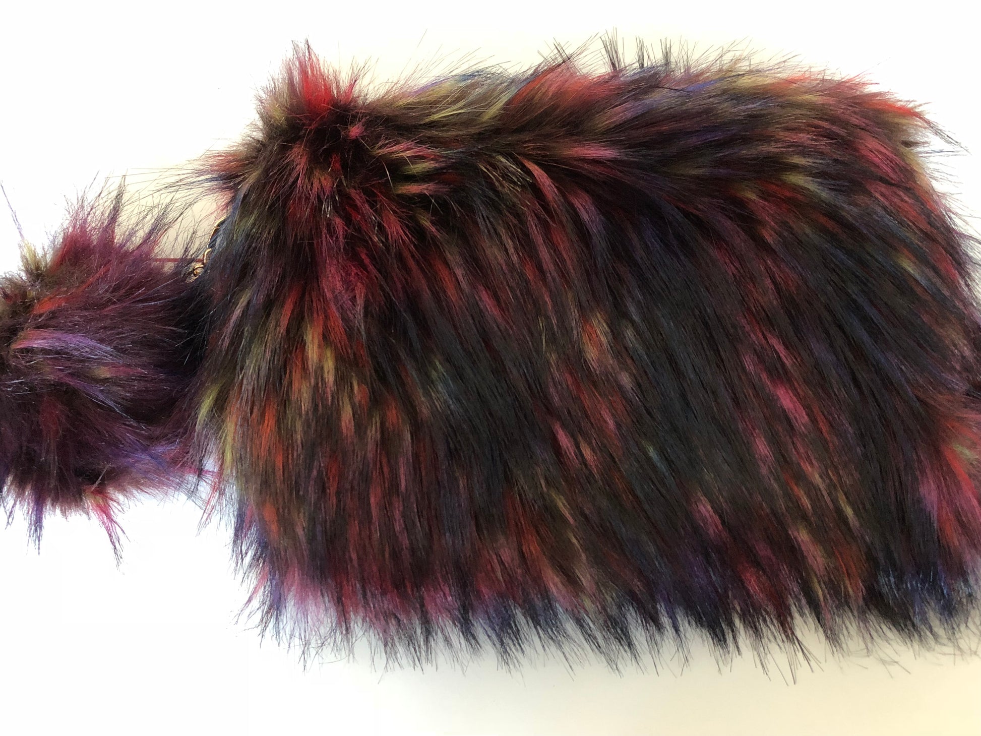 Super plush clutch that feels amazingly similar to real fur. Has a long gold chain attachment that turns it into a purse. Inner pocket for small knacks.