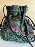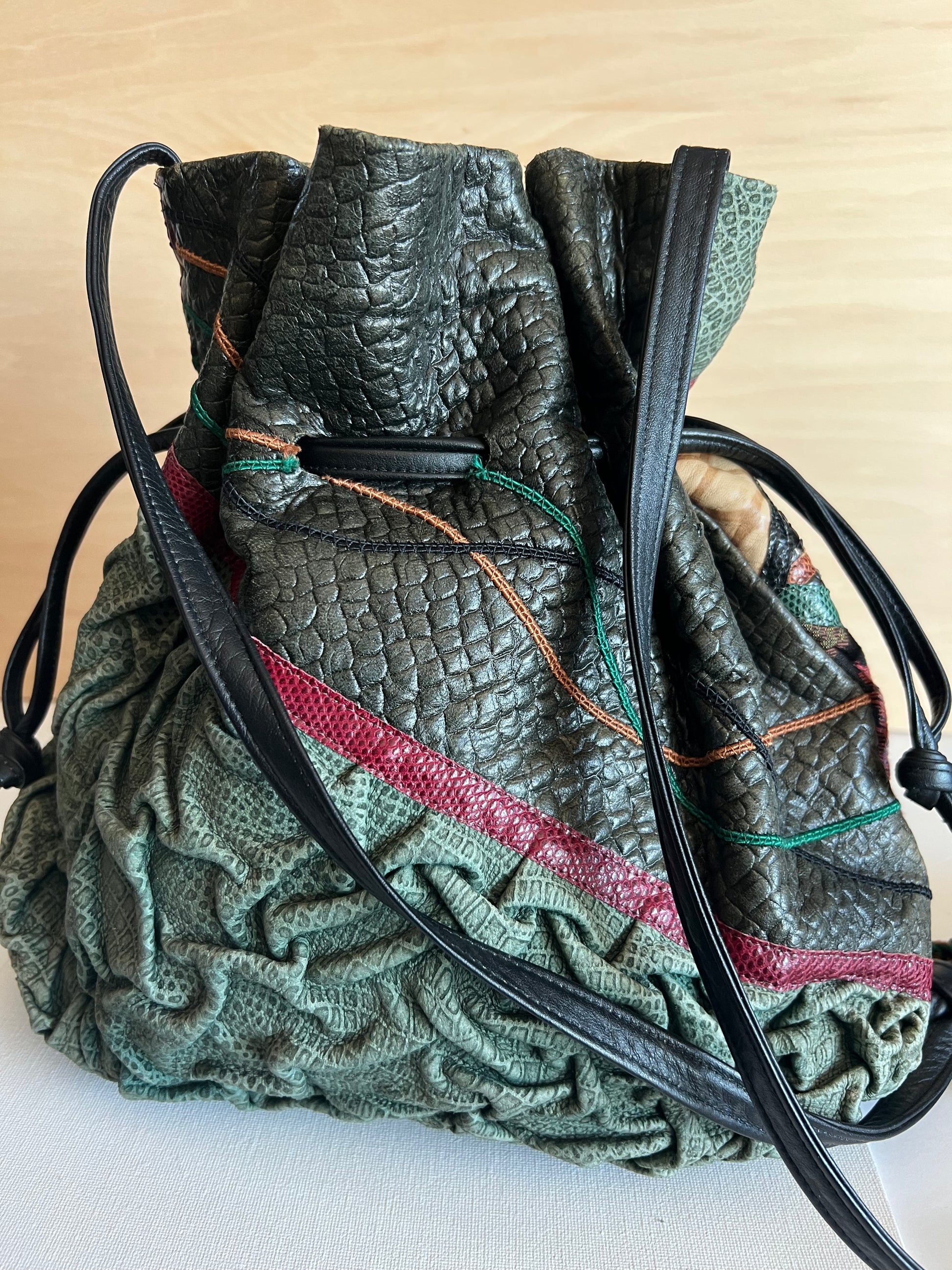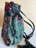 Vintage Carlos Falchi textured textile shoulder bucket bag. Amazing detail of leather and other textiles beautifylly married into one bag. Features a tassel with wooden bead. Crossbody style with long strap.