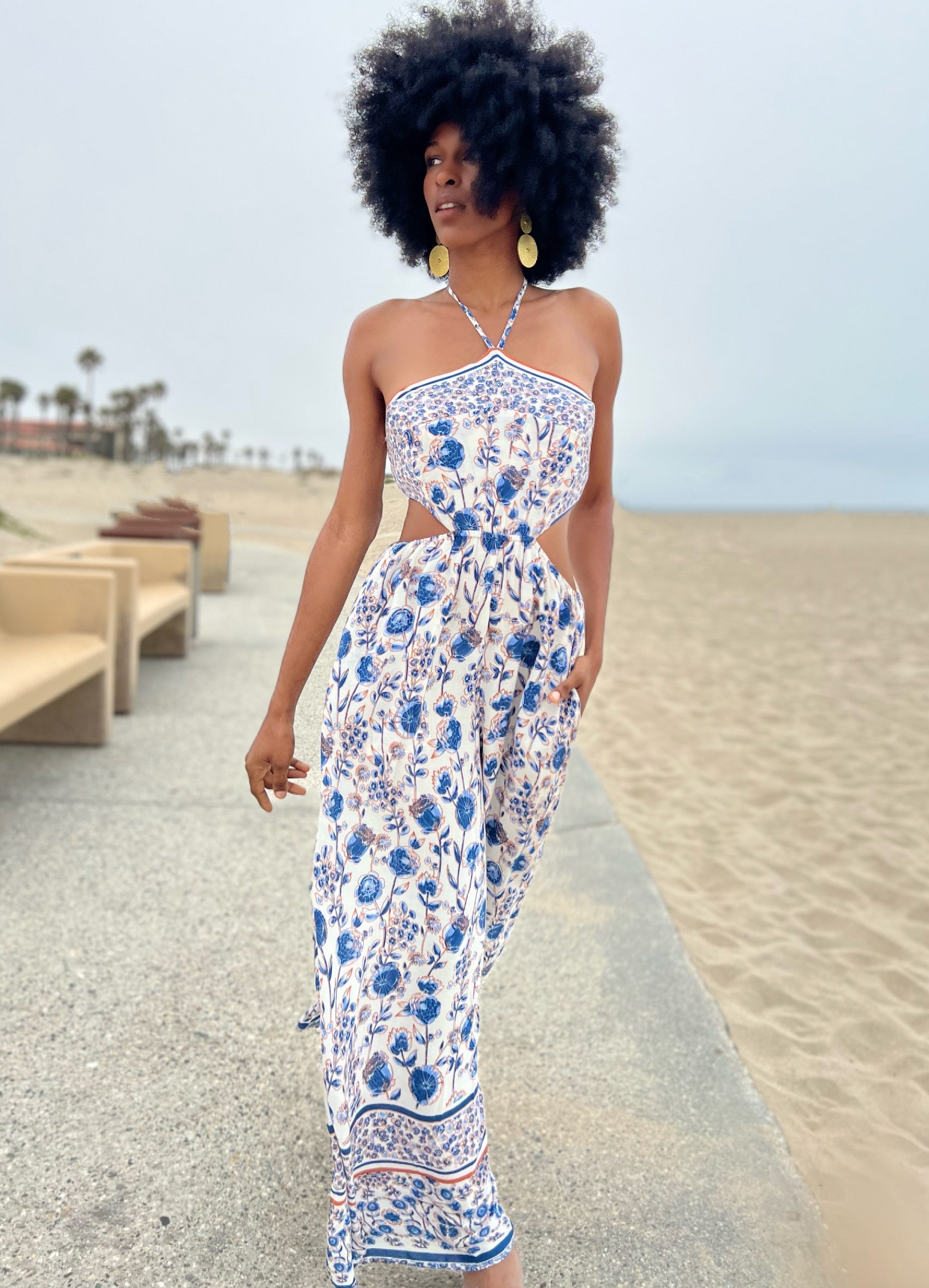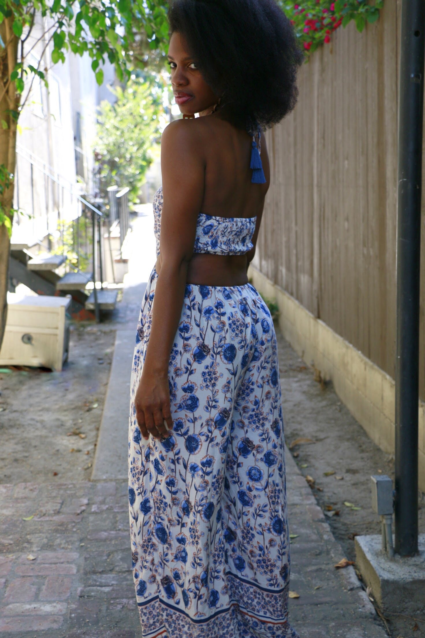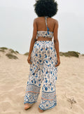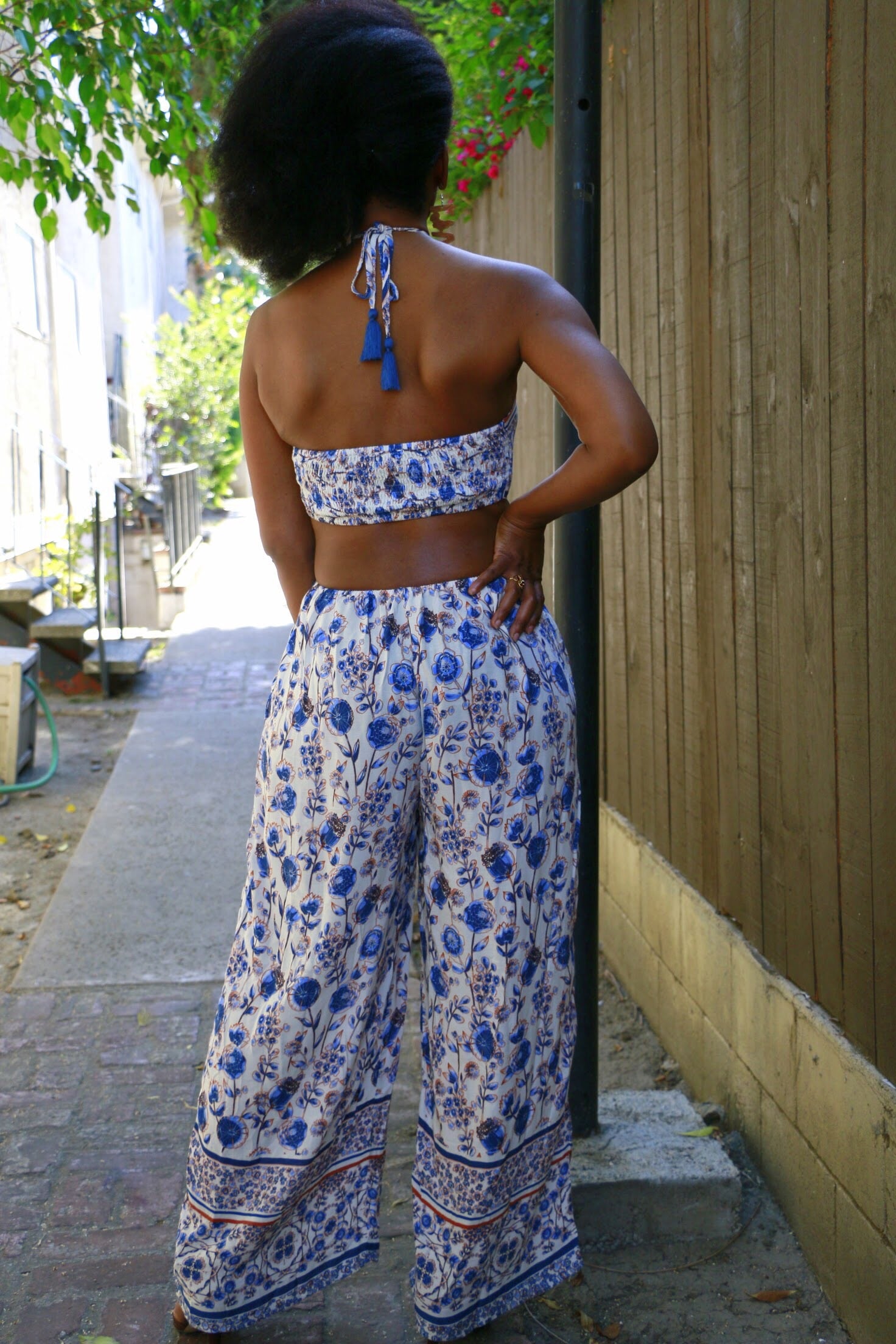 One piece 70’s style, halter jumpsuit. Elastic stretch in back on both top and bottom pieces. Tassel strings that tie around the neck. Unique Moroccan print around the ankle of pants.
