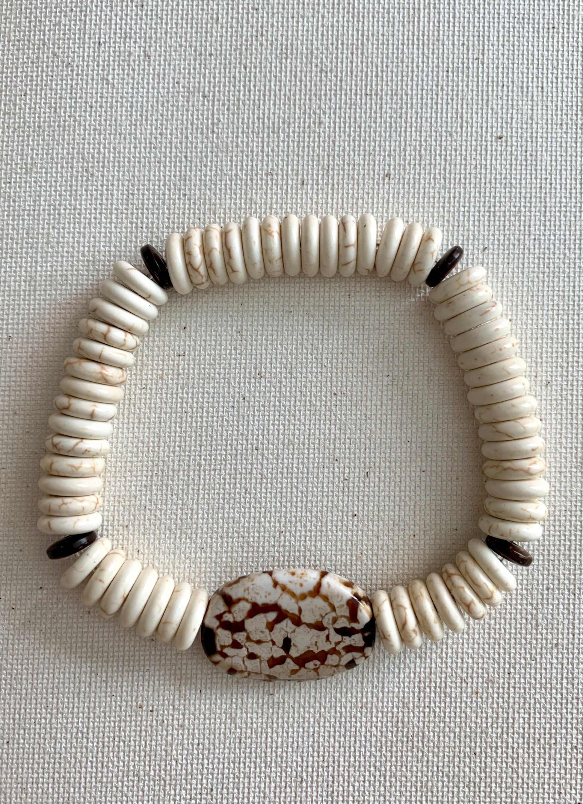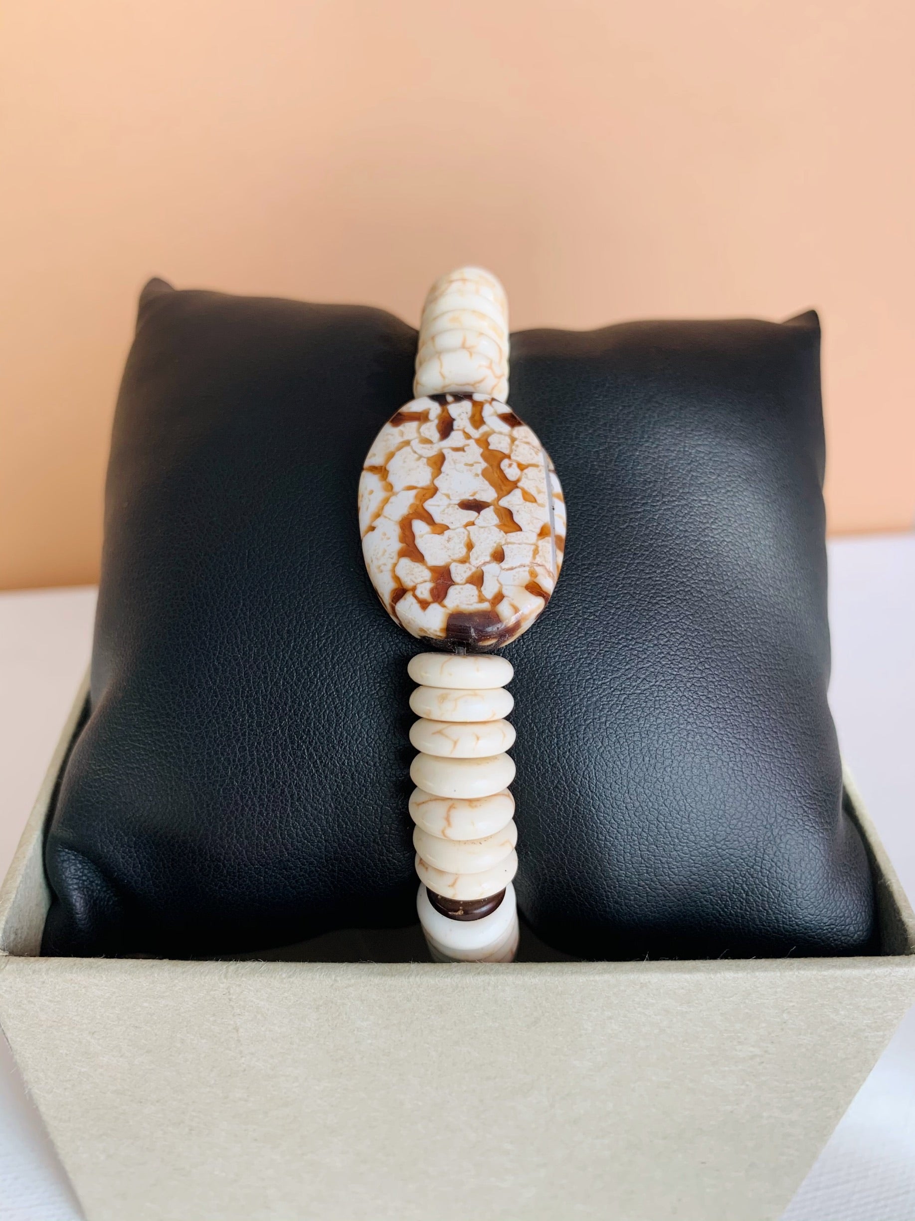 This versatile bracelet has all of the wonders of fall with the Picasso Jasper beads. The coconut shells accentuate the cream colored stones. The agate center stone is an amazing crackled design that works together perfectly.
